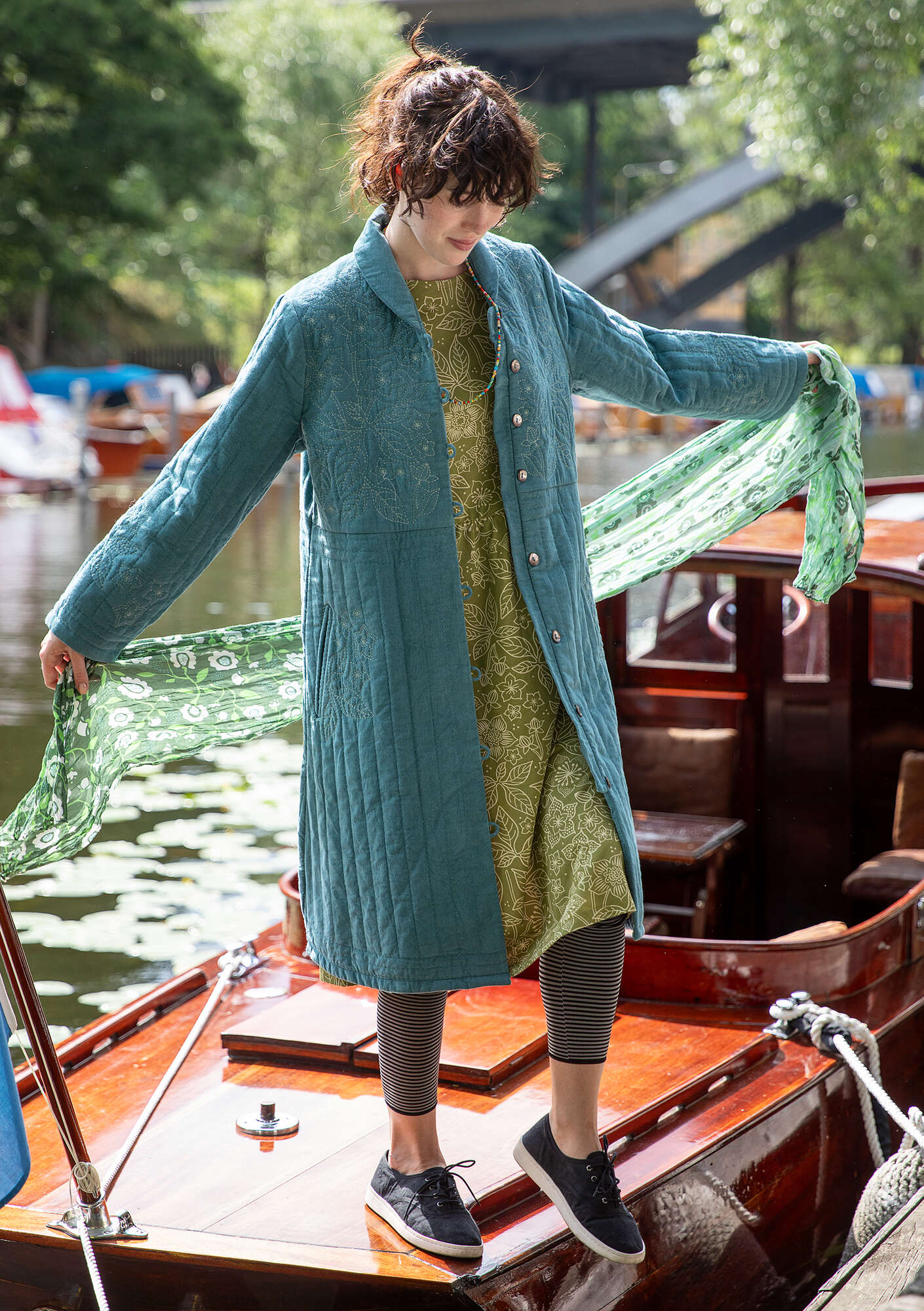 • Fully lined corduroy coat with a velvety soft feel. Lightly padded and with a quilted stripe. Stand-up collar. Embroidered detailing front and back. Welt pockets and a slit with closure on both the sleeves and centre back.