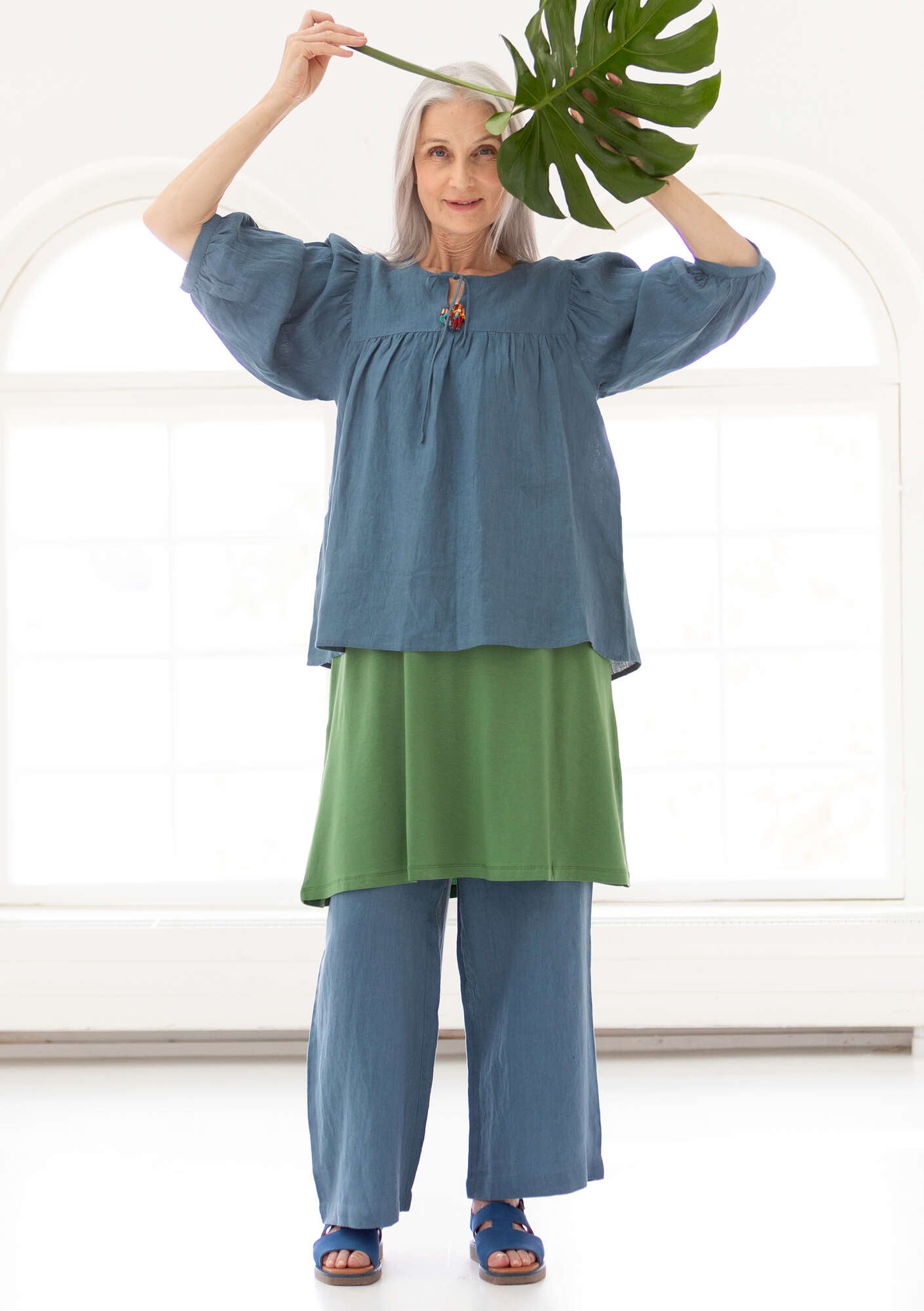 Whimsical style with a generous fit. Yoke with front slit and tie. Puff sleeves that hit just below the elbow. Comes in solid colours and with a yarn-dyed check print.
