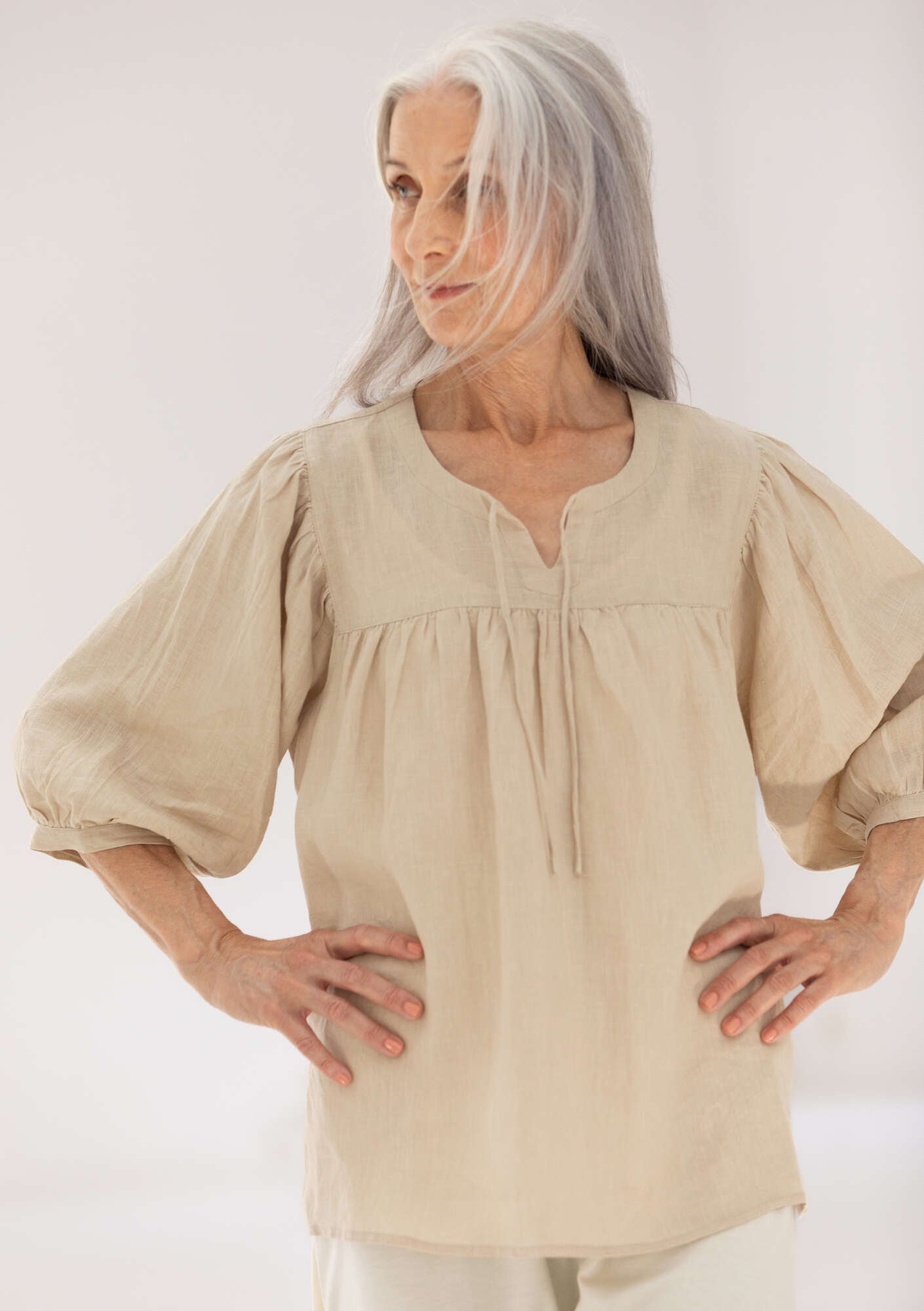 • Whimsical style with a generous fit. Yoke with front slit and tie. Puff sleeves that hit just below the elbow. Comes in solid colours and with a yarn-dyed check print.