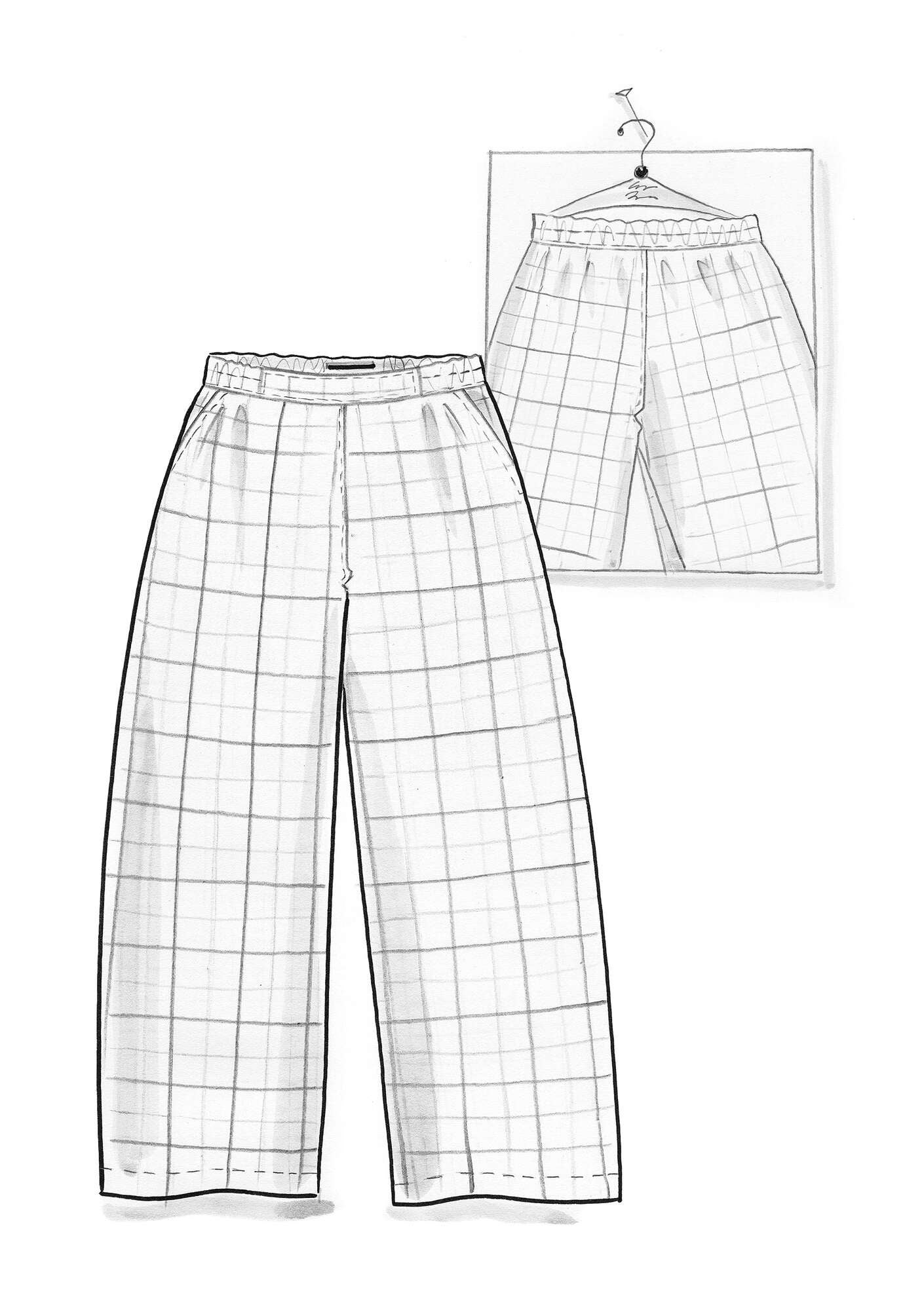 Full-length linen trousers with a beautiful drape. A choice of solid colours and a yarn-dyed check. Simple elastic waist. Straight, wide legs and handy side pockets.