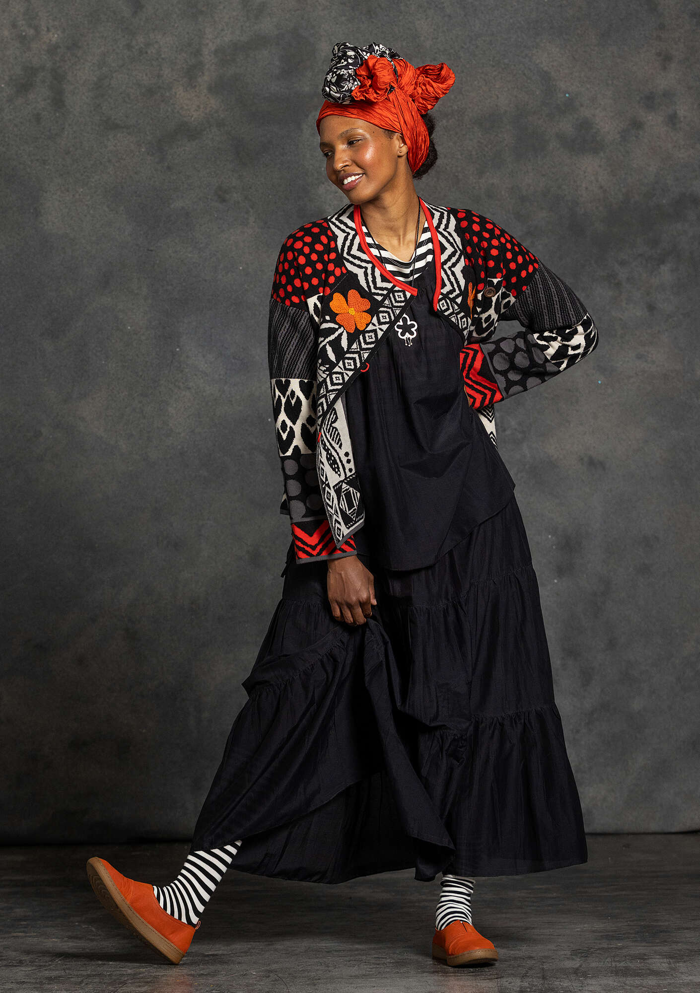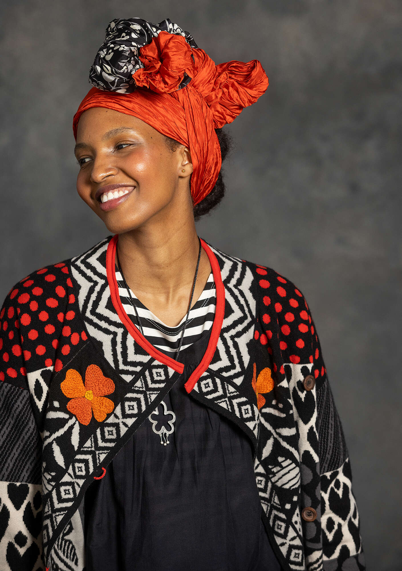 • Jacquard wrap cardigan with a slightly cropped silhouette and two wooden buttons for closure. Featuring a mix of beautiful patterns, three-quarter sleeves and a neat stand-up collar. Jetted pocket and a pretty hand-embroidered flower on both sides.