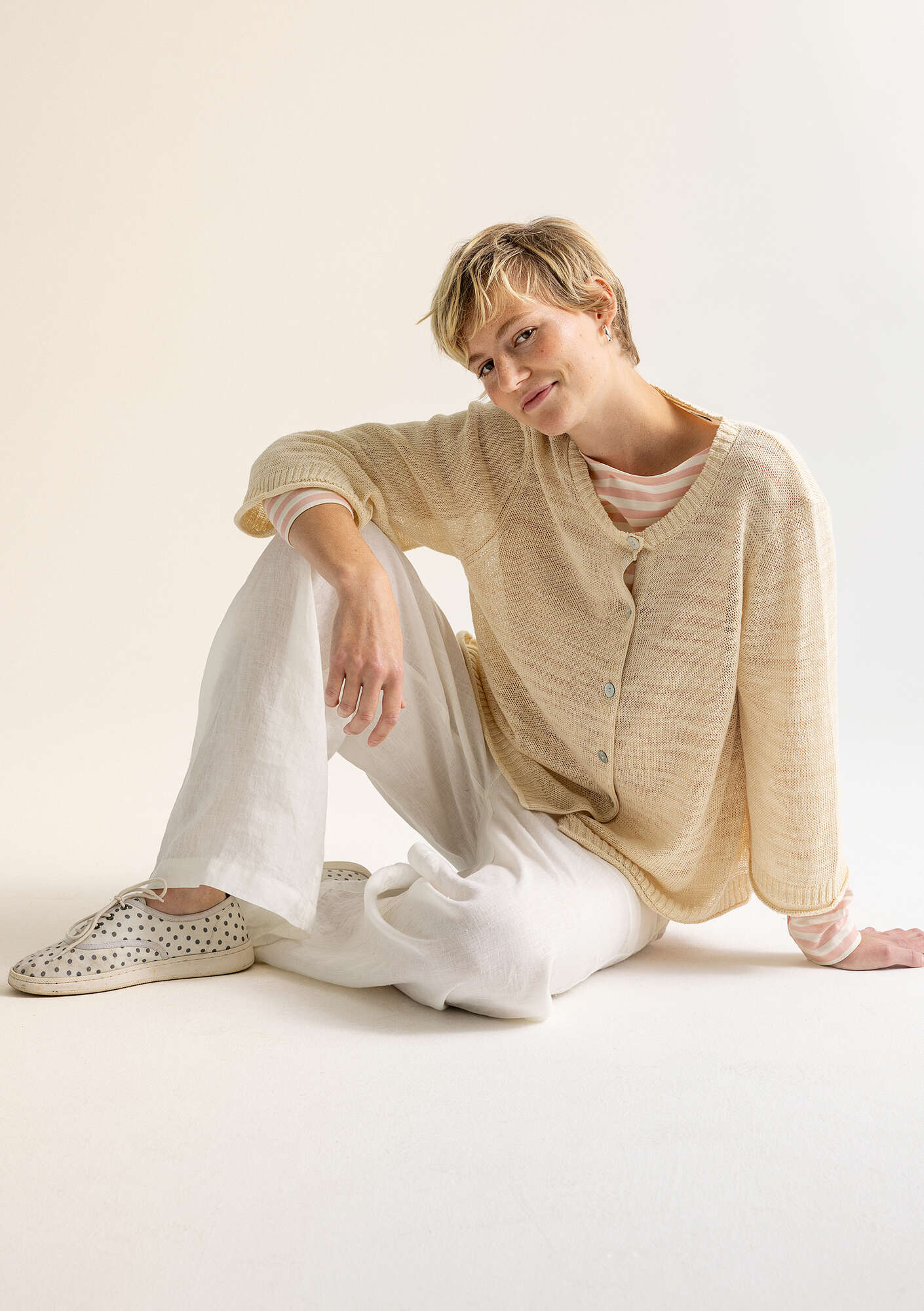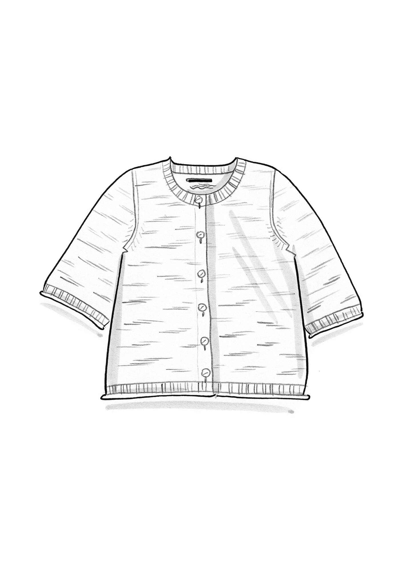 51% cotton/49% linen. The linen is made from dew-retted flax. Dew-retting is a natural process that uses less water, no chemicals, and lets the sun and dew do the work. 48.5% of the cotton is certified organic. 2.5% of the cotton is recycled and certified. Delicate wash at 40°. Gently stretch and reshape the garment while damp. Dry flat. Store horizontally. 3-4% shrinkage. Made in Dongguan, China.