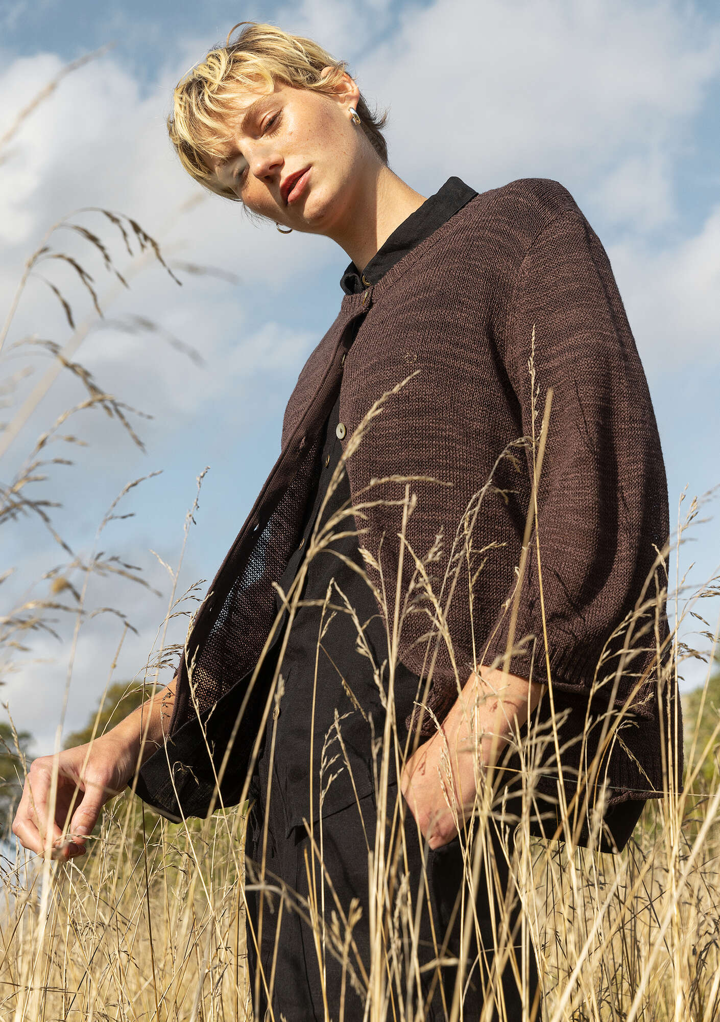 51% cotton/49% linen. The linen is made from dew-retted flax. Dew-retting is a natural process that uses less water, no chemicals, and lets the sun and dew do the work. 48.5% of the cotton is certified organic. 2.5% of the cotton is recycled and certified. Delicate wash at 40°. Gently stretch and reshape the garment while damp. Dry flat. Store horizontally. 3-4% shrinkage. Made in Dongguan, China.