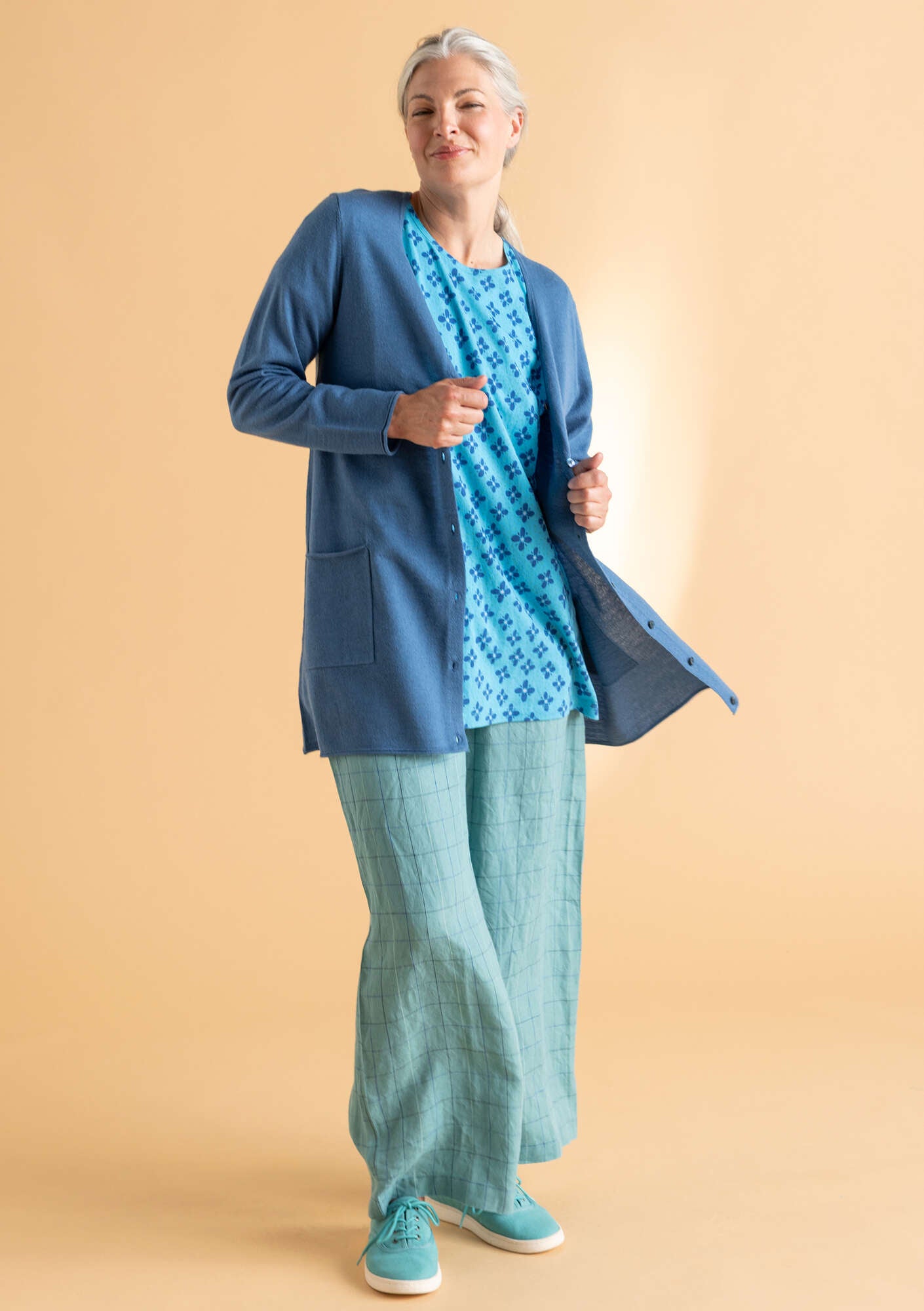 • V-neck cardigan with full-length sleeves. Shaped at the top, flaring gently towards the hem. Neat rolled edges. Patch pockets and dyed mother-of-pearl buttons. Colour accent details on the inside.