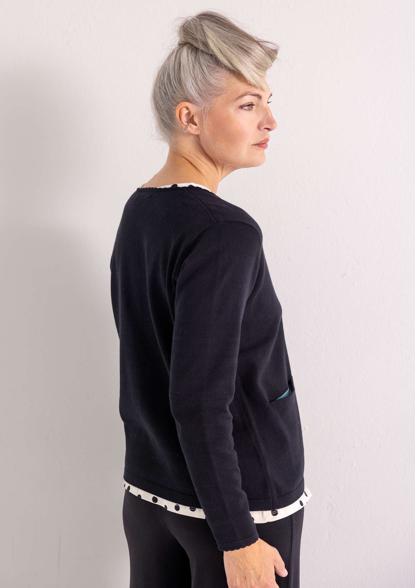 A simple style staple finished at the neck and cuffs with delicate scalloped edges. Accent-colour rolled edging at the front and as small playful details inside. Pocket in one side. Mother-of-pearl buttons.