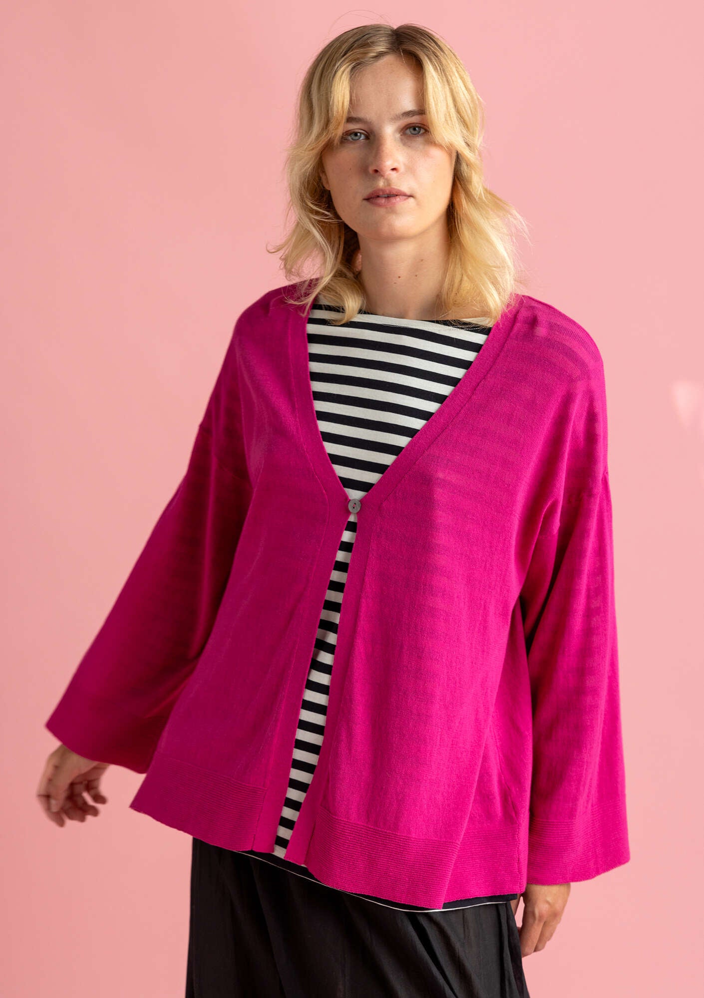 A breezy, relaxed-style cardigan. V-neck and bracelet length sleeves. Mother-of-pearl button with loop at the front. Featuring fine textured borders at the hem and cuffs.