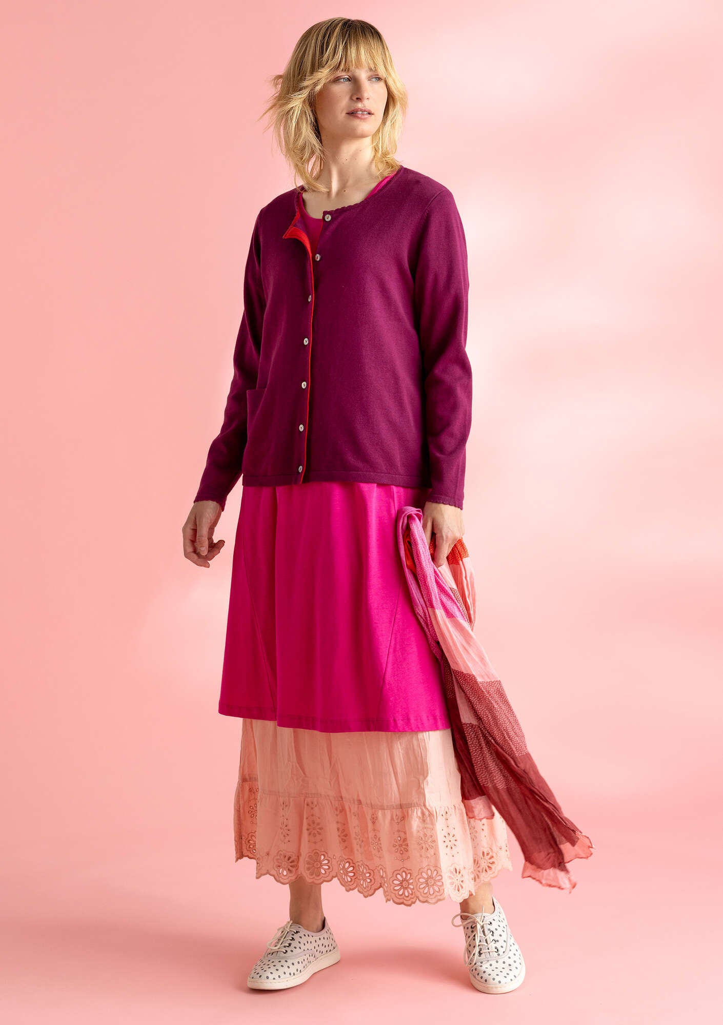 • A simple style staple finished at the neck and cuffs with delicate scalloped edges. Accent-colour rolled edging at the front and as small playful details inside. Pocket in one side. Mother-of-pearl buttons.