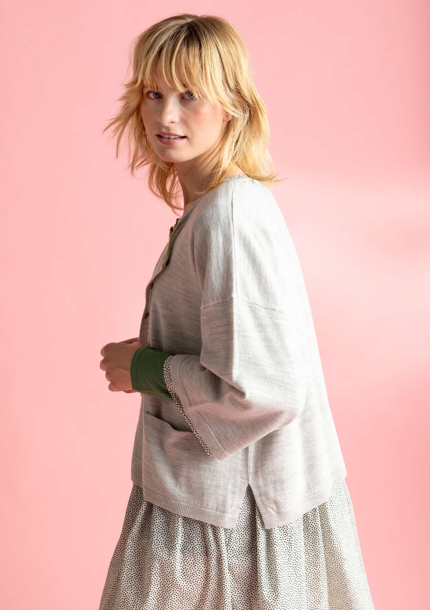 Slightly cropped style with a generous fit. The sleeves hit below the elbow. Finished with neat ribbing around the hem and cuffs. Colour accent on the inside of the practical pocket. Slits at the sides.