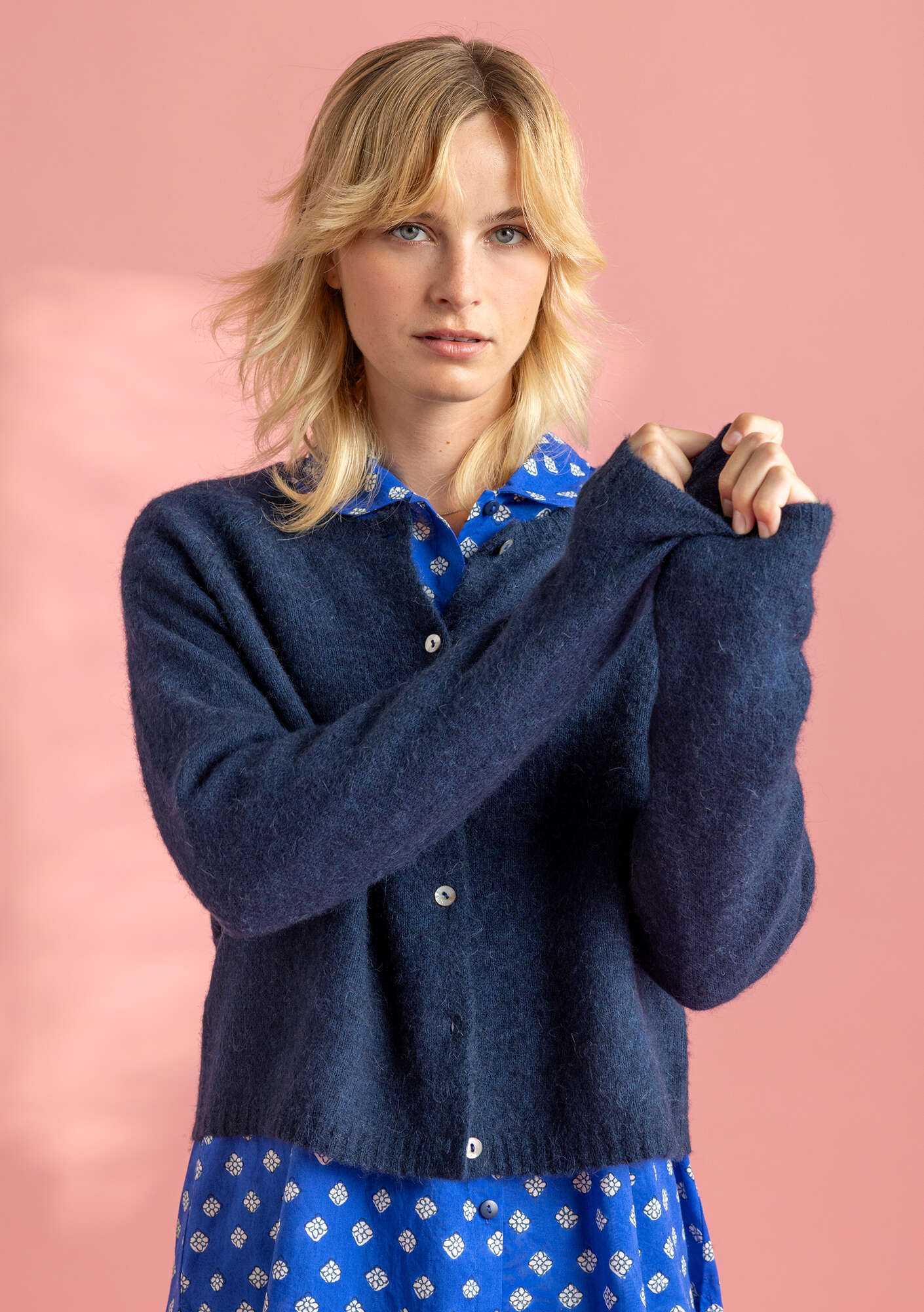 Lightweight cardigan with full-length, raglan sleeves. The cropped silhouette partners perfectly with a dress. Finely ribbed hem and cuffs. Knitted in a soft and slightly fuzzy alpaca blend.