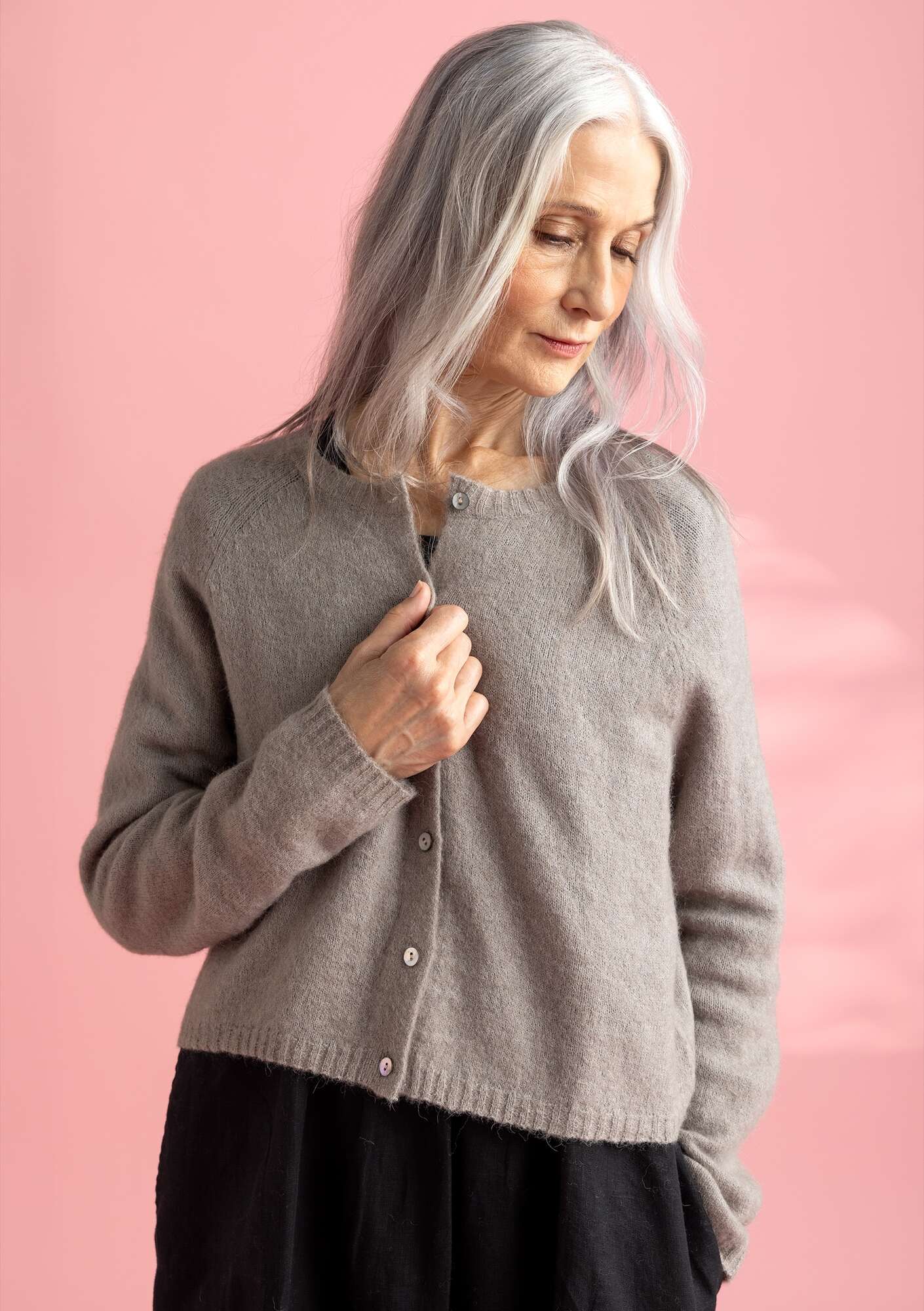 Lightweight cardigan with full-length, raglan sleeves. The cropped silhouette partners perfectly with a dress. Finely ribbed hem and cuffs. Knitted in a soft and slightly fuzzy alpaca blend.