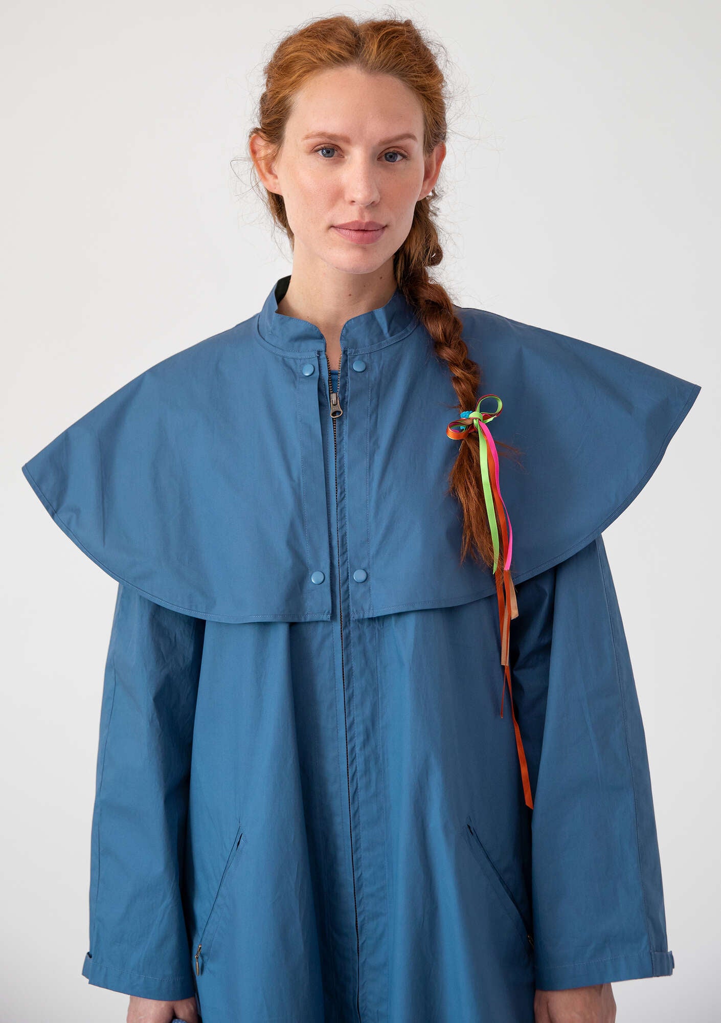 • Elegant jacket with an A-line silhouette. Accent colour detailing on the inside. Practical press studs on the large pelerine collar allow for easy removal. Sleeve width can be adjusted. With a zip down the front and on the pockets too.