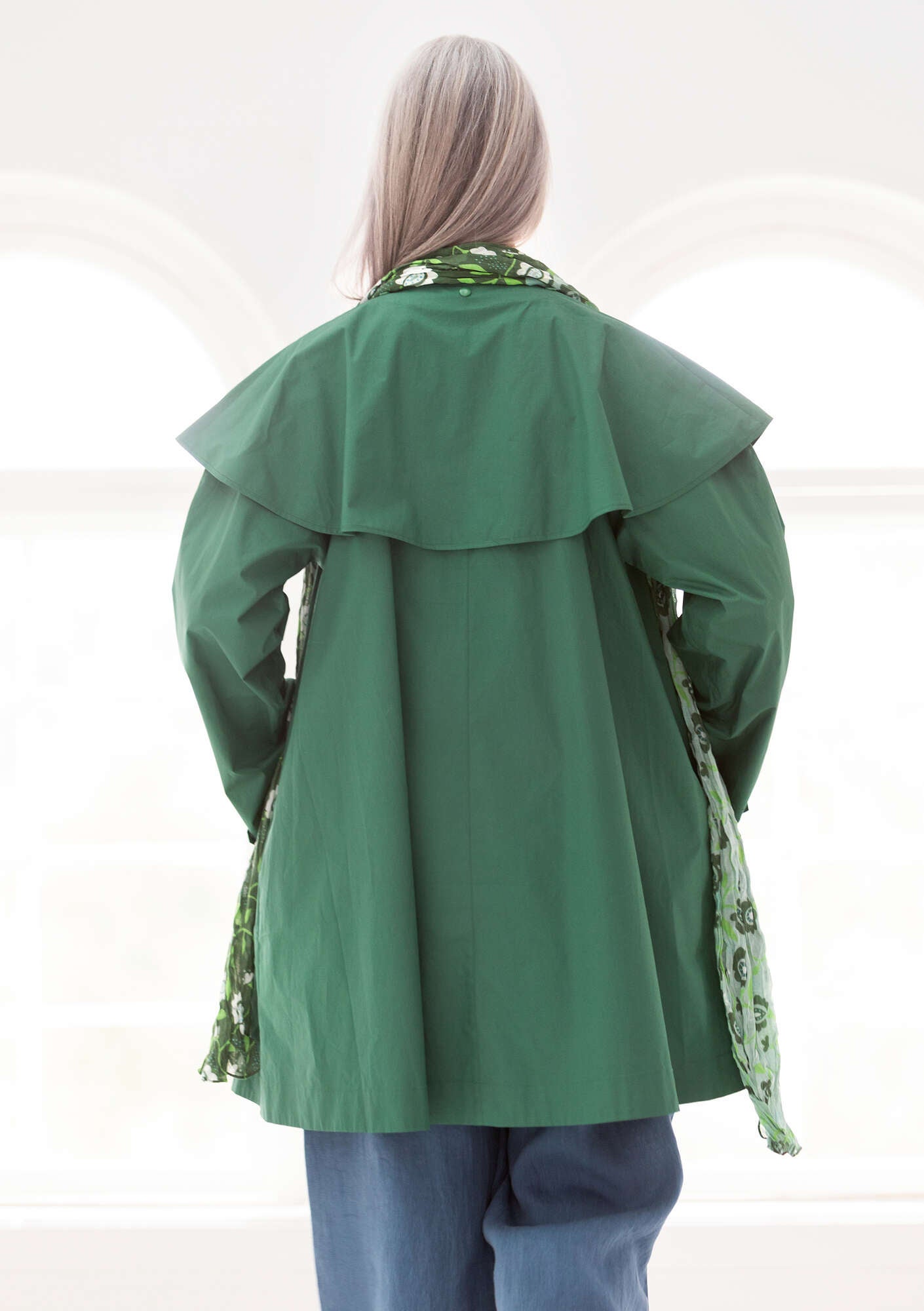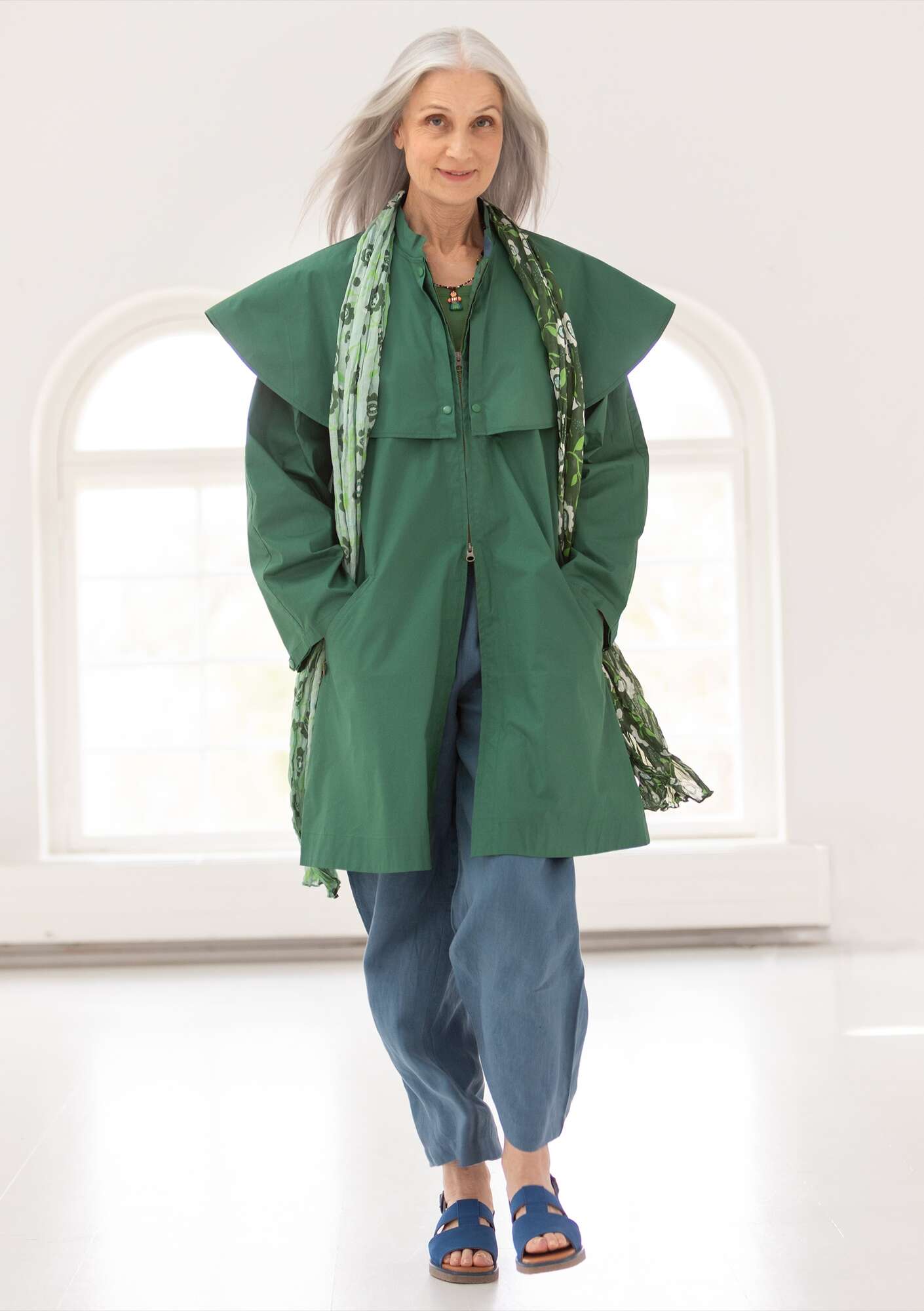 Elegant jacket with an A-line silhouette. Accent colour detailing on the inside. Practical press studs on the large pelerine collar allow for easy removal. Sleeve width can be adjusted. With a zip down the front and on the pockets too.