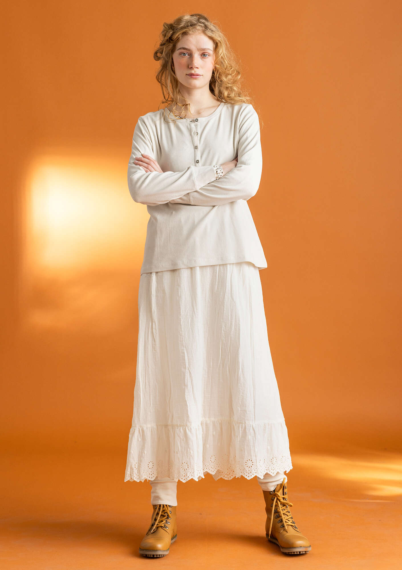 A simple silhouette with an elastic waistband, embroidered dots and a broderie anglaise hem. Adjustable elastic by means of a small button, for personal fit.