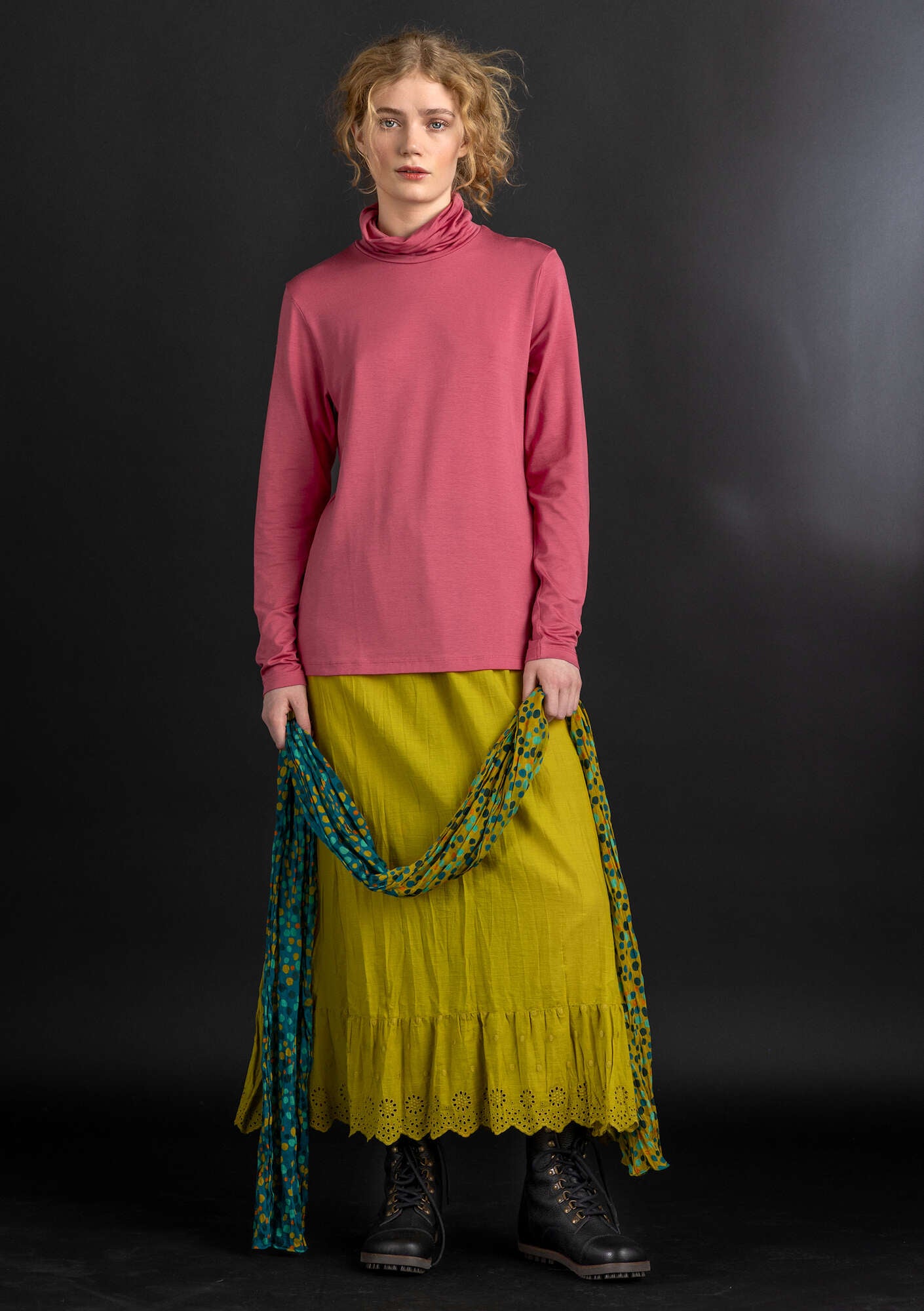 • A simple silhouette with an elastic waistband, embroidered dots and a broderie anglaise hem. Adjustable elastic by means of a small button, for personal fit.