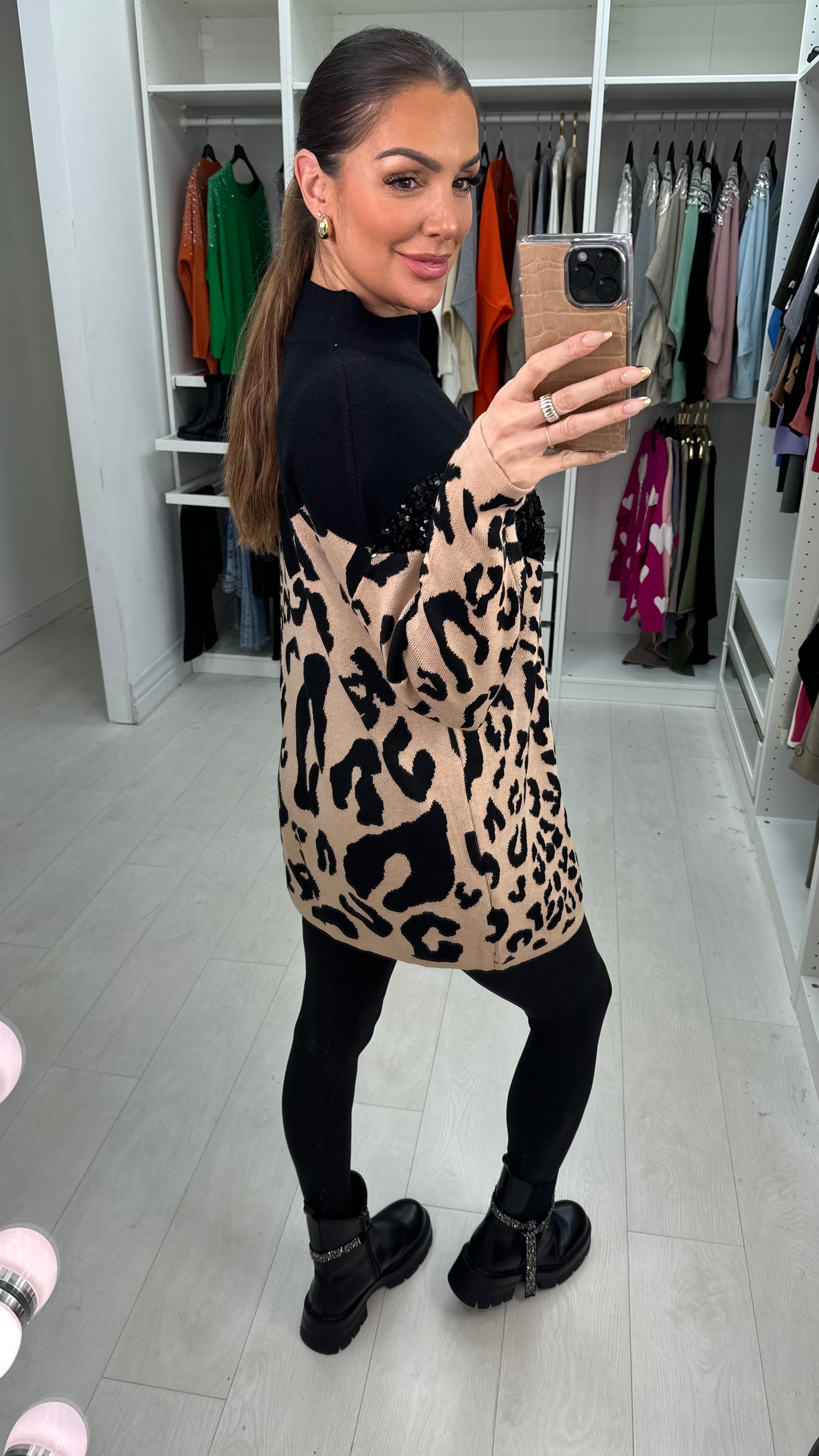 Adriana Sequin Panel Cheetah Detail Longline Jumper