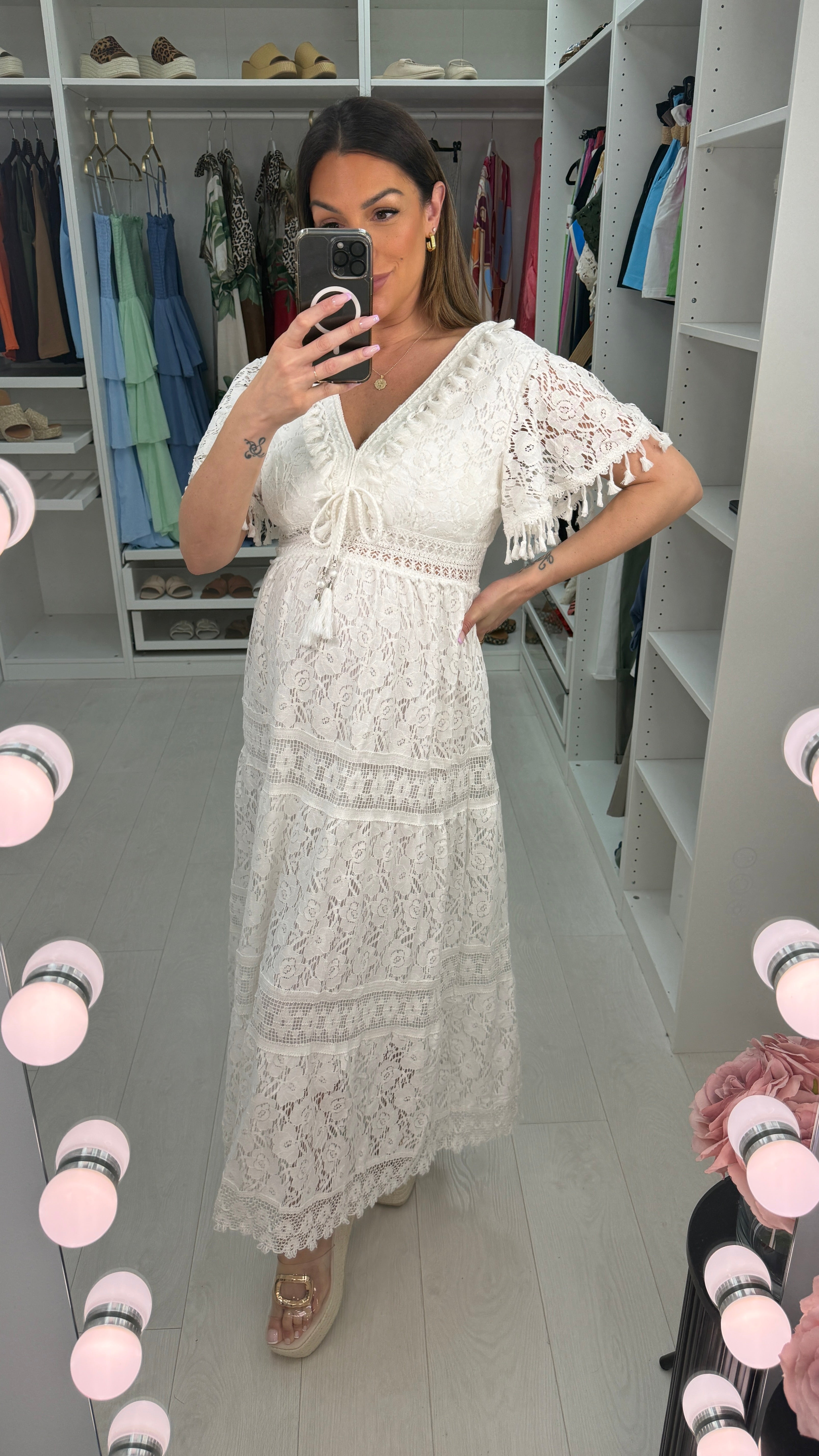 Embrace elegance with the Alex Floral Lace Tassel Detail Maxi Dress. Featuring delicate floral lace lining and a flattering V-neck with tassel accents, this short-sleeve dress offers a floaty, lightweight feel perfect for warm days. The tassel hem adds a playful touch, making it an ideal choice for effortless style and comfort.