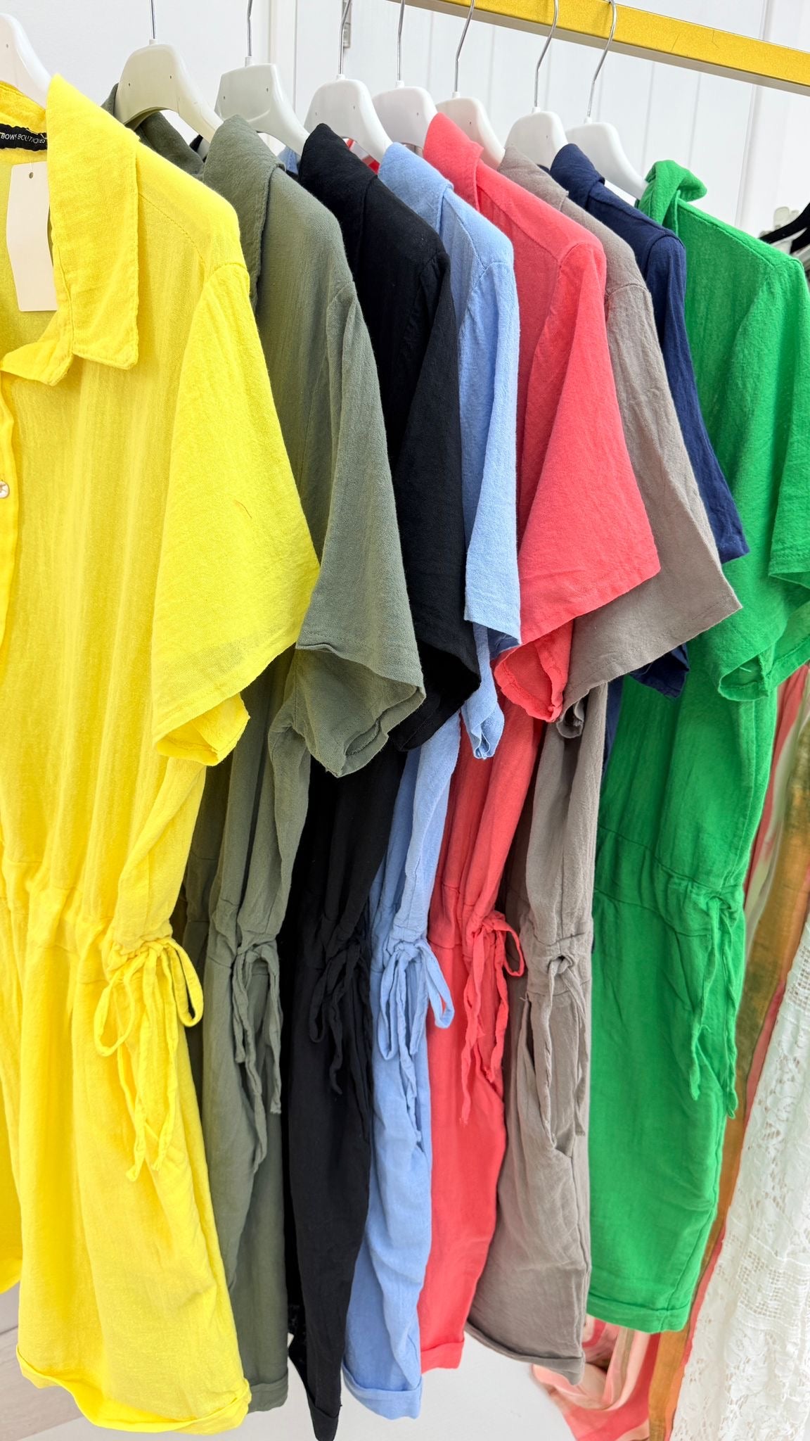 The Amelie Plain Adjustable Tie Side Playsuit combines comfort and style effortlessly. Featuring a button-front design with a classic collar and short sleeves, its loose fit ensures ease of movement. The adjustable drawstring tie at the waist allows you to customize the silhouette for a flattering look all day long. Perfect for casual outings or relaxed weekends, this playsuit offers a versatile and chic addition to your wardrobe.