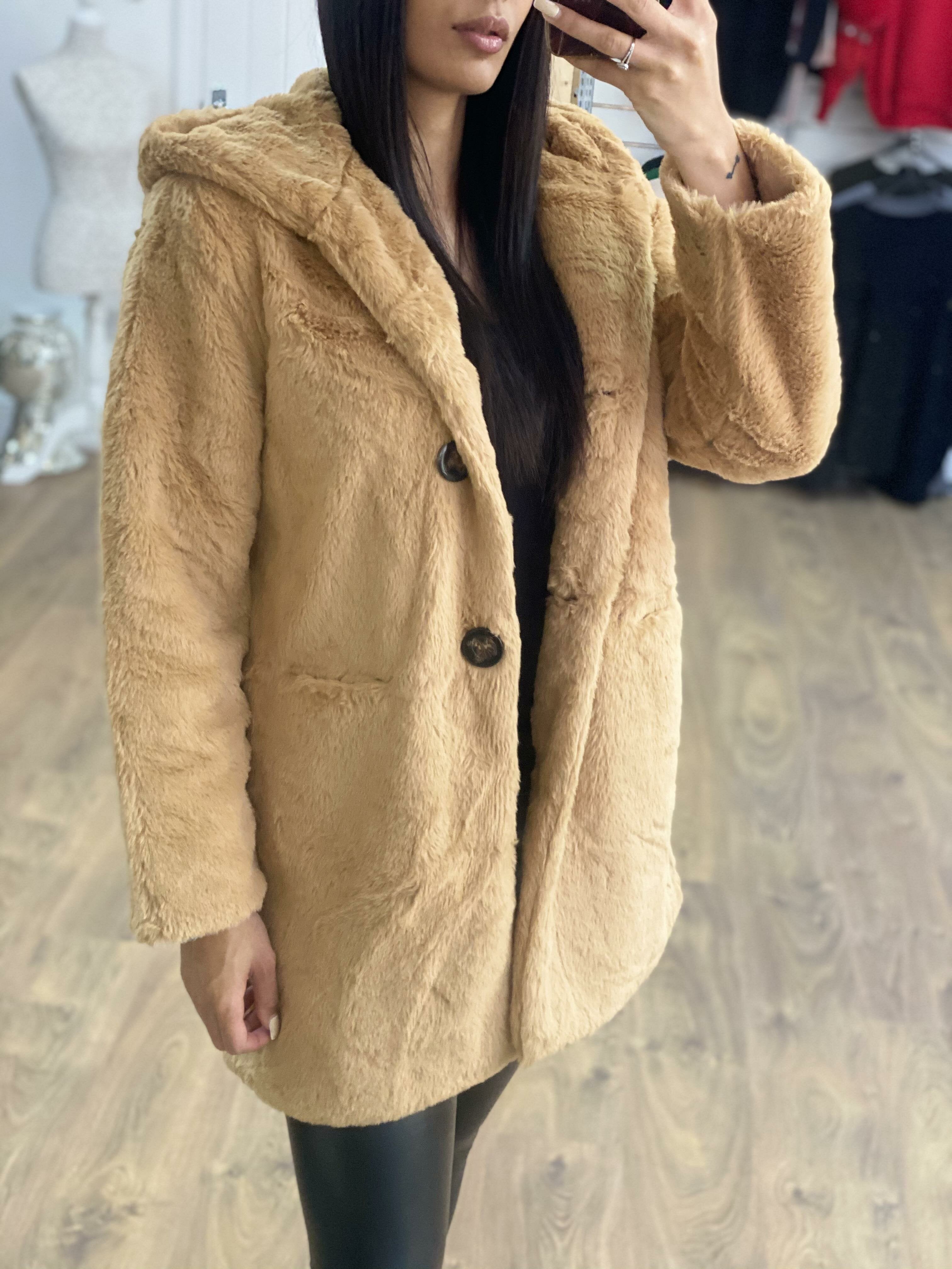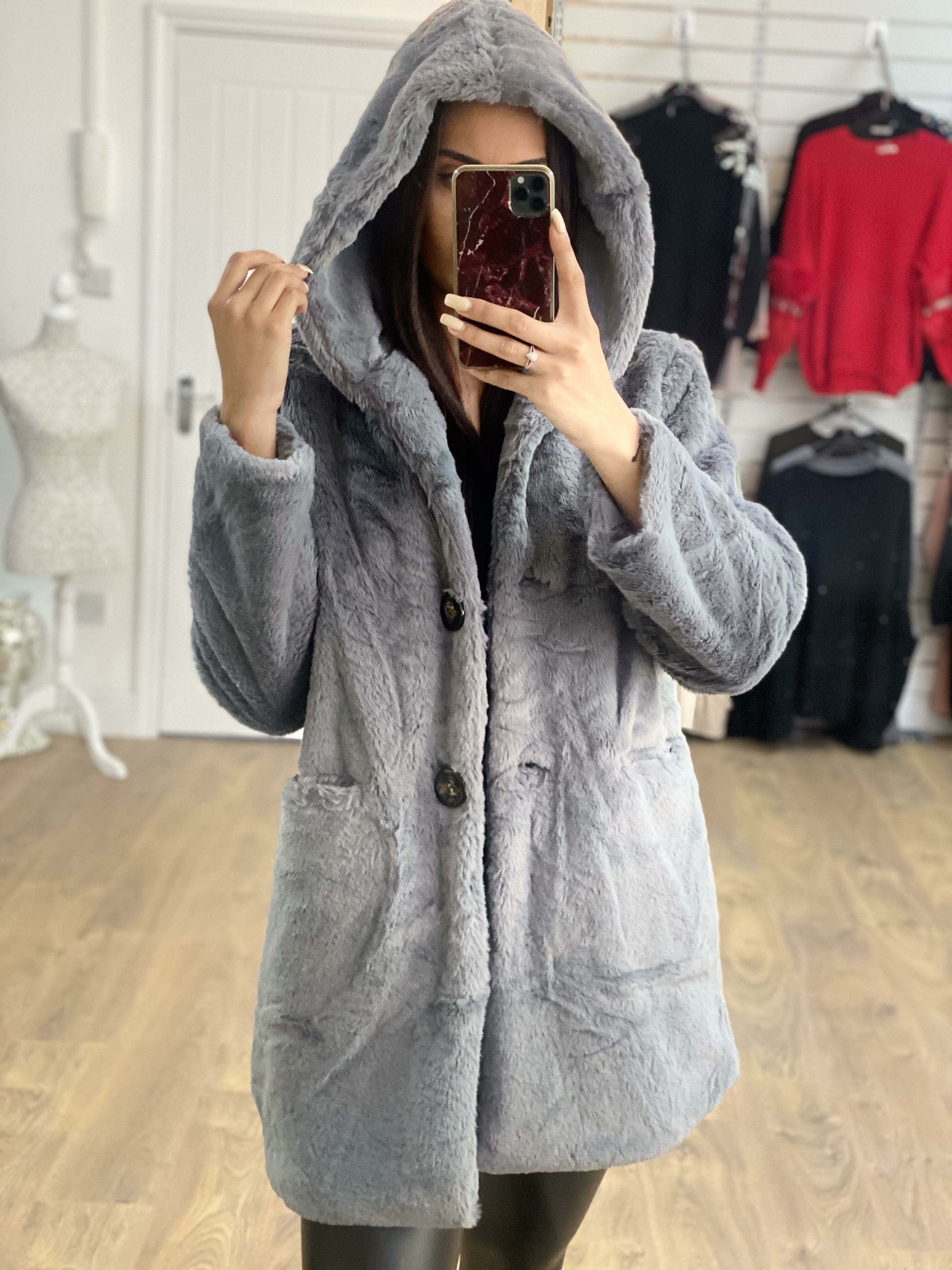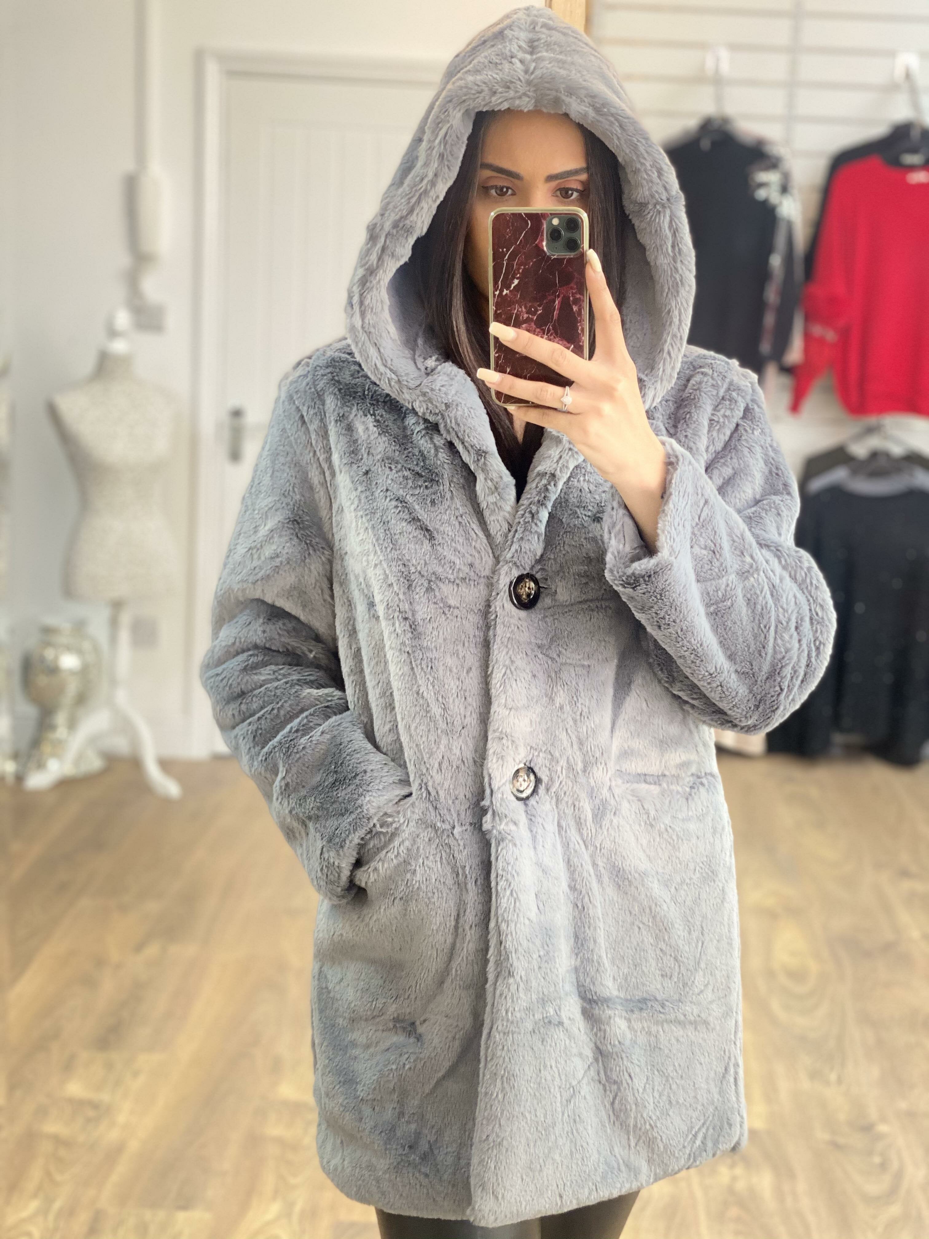 Amilie Faux Fur Hooded Button Detail Oversized Coat