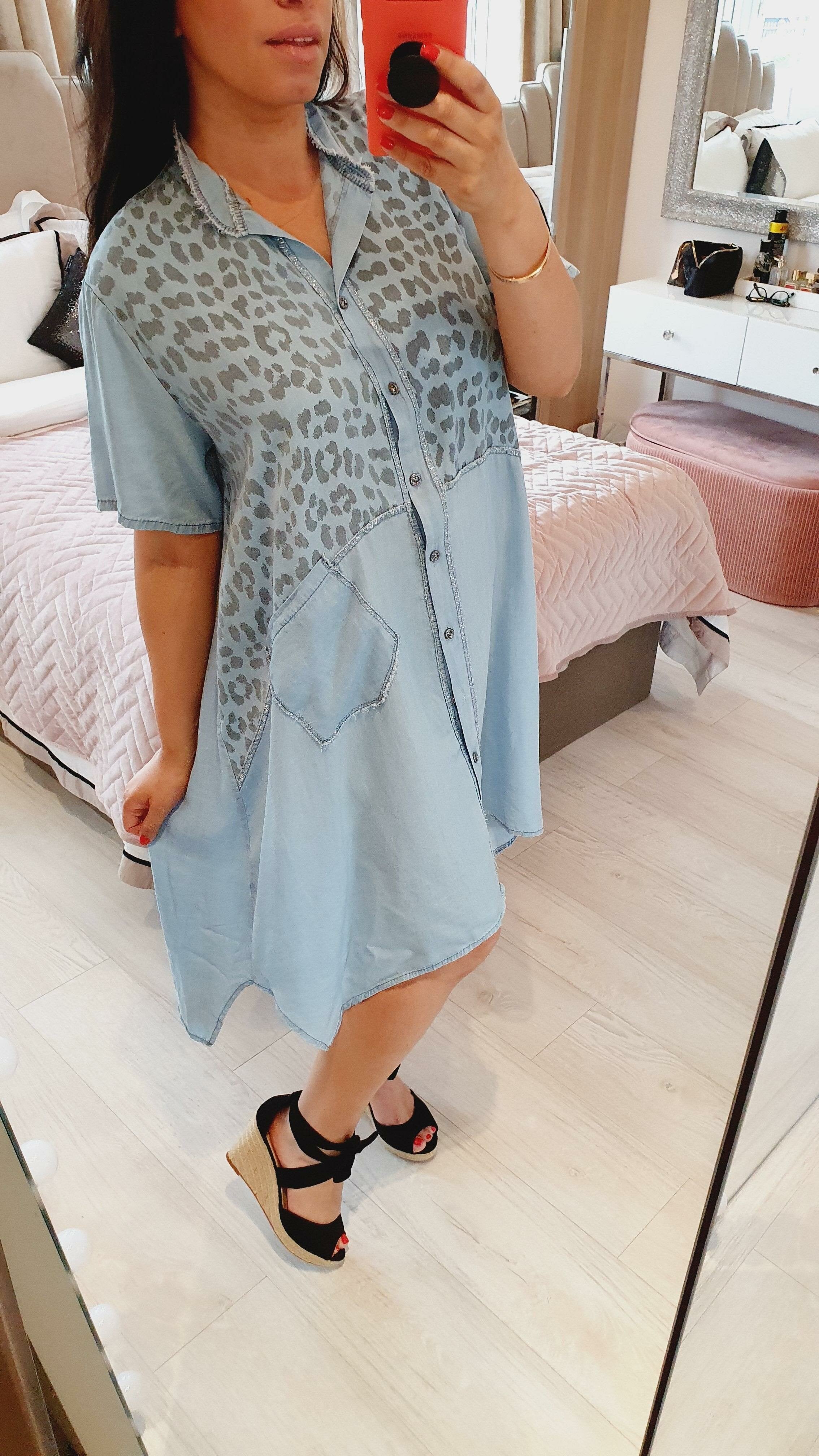 Aziel Light Denim Leopard Print Dipped Hem Glitter Dress
