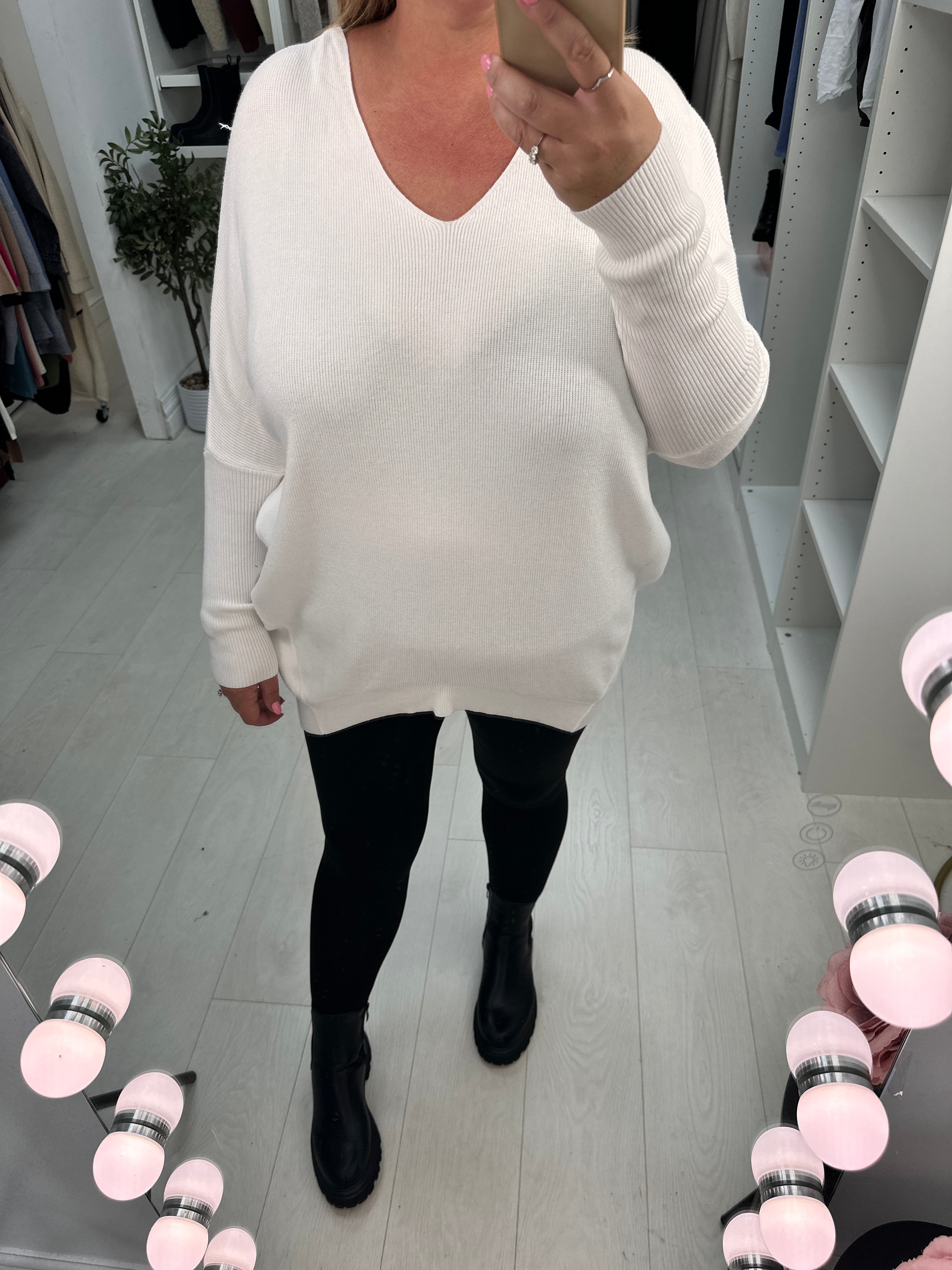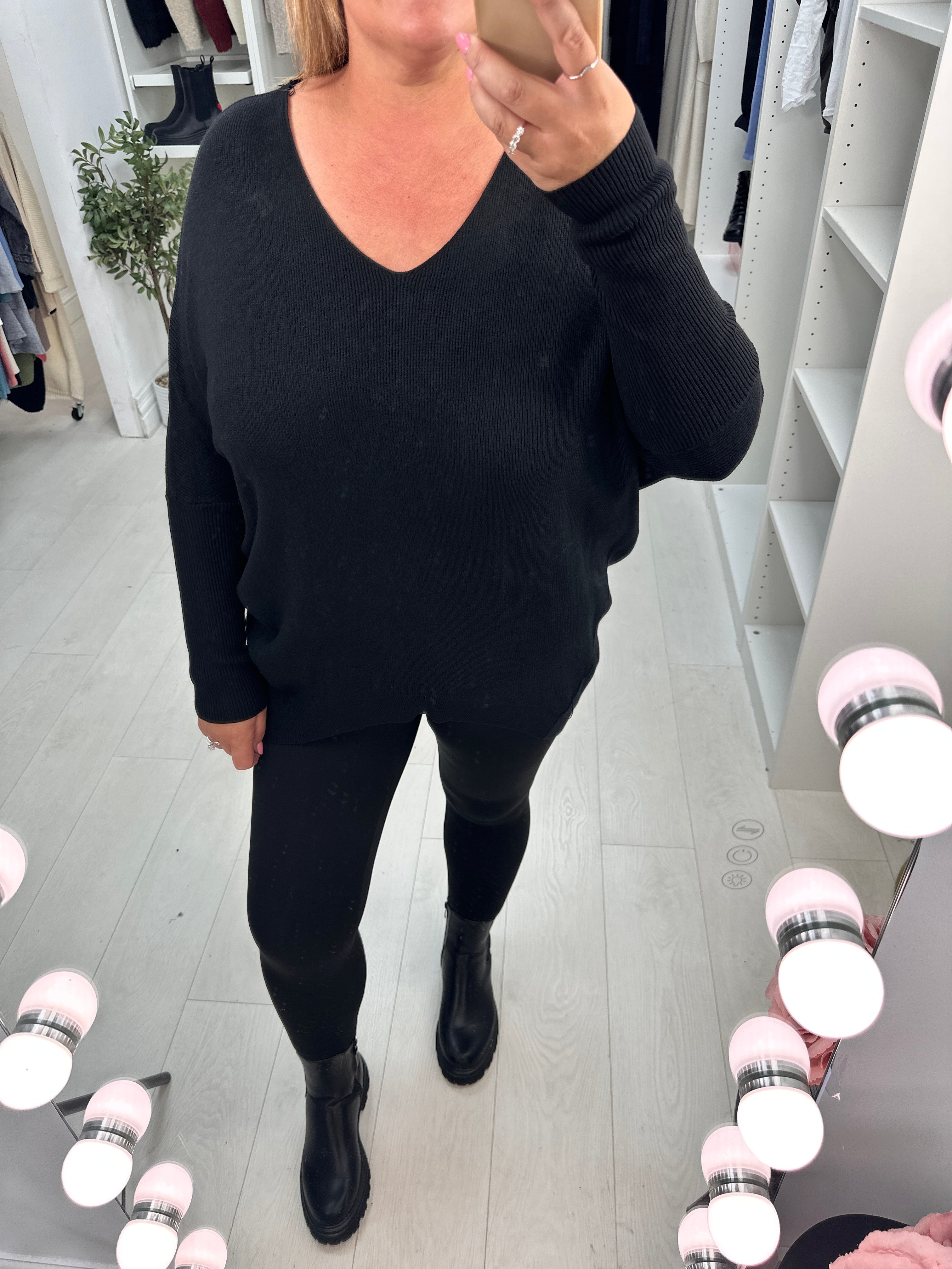 This Bethan jumper combines comfort and style with its plain ribbed fabric and loose fit. Featuring a flattering V-neck and long fitted sleeves, it offers a sleek silhouette. The standout embellished cut-out back adds a unique, eye-catching detail, while the high-low hem enhances its modern appeal. Perfect for elevating your everyday wardrobe with effortless charm.