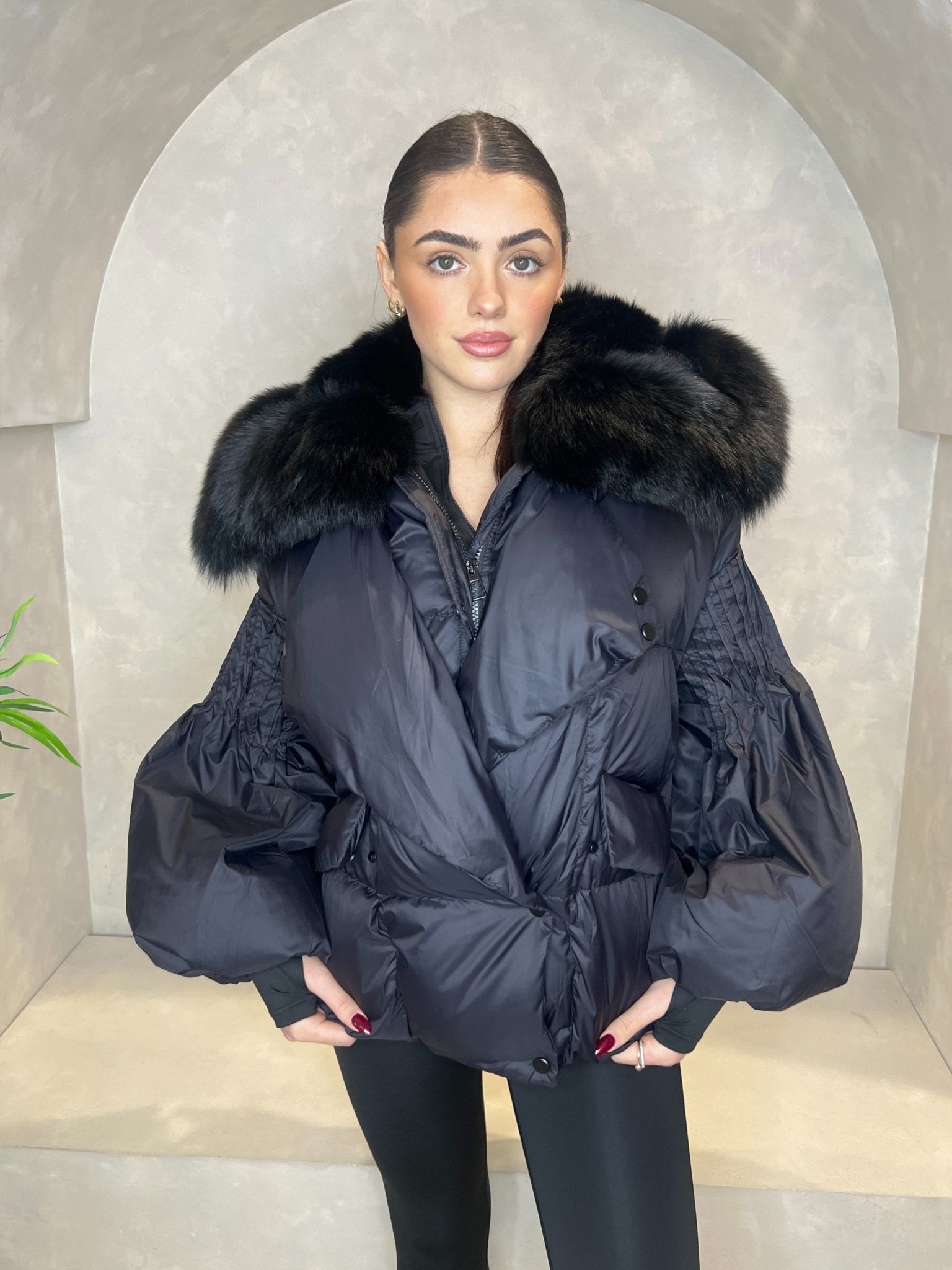 Crafted with style and warmth in mind, our Black Luxury Fur Collar Jacket features quilted panel detail and a plush fox fur collar for added elegance. The pleat detail balloon sleeve and cuffed sleeves provide a chic touch, while the popper and zip fastening ensure secure closure. Don't worry about storage with the large pockets.