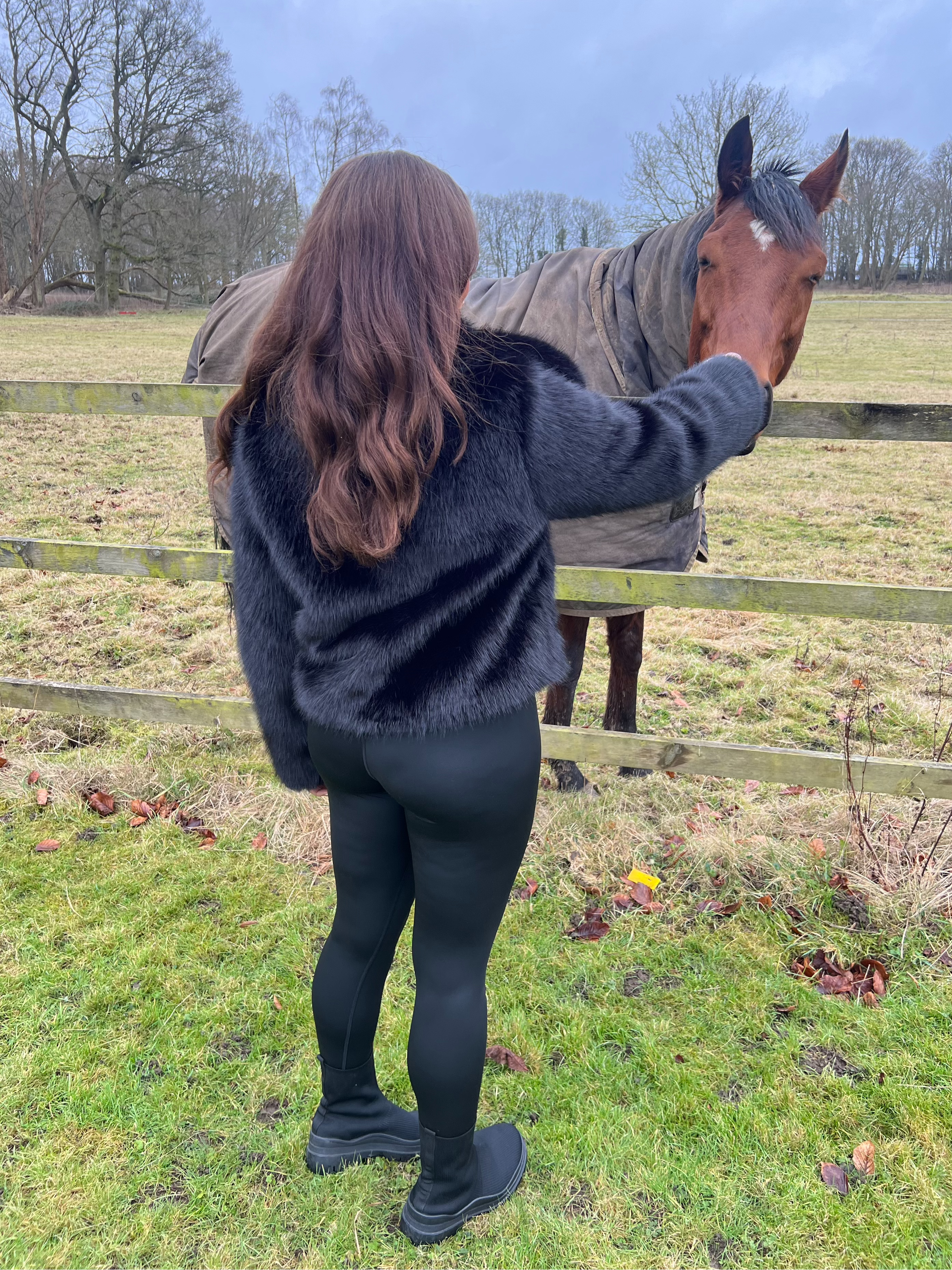 Expertly crafted with a large, luxurious collar and long sleeves for warmth and style. Made from premium faux fur, this elegant jacket is both fashionable and functional. Fastens securely with a hook and eye closure. Stay stylish and cozy this season with our Premium Faux Fur Collared Jacket.