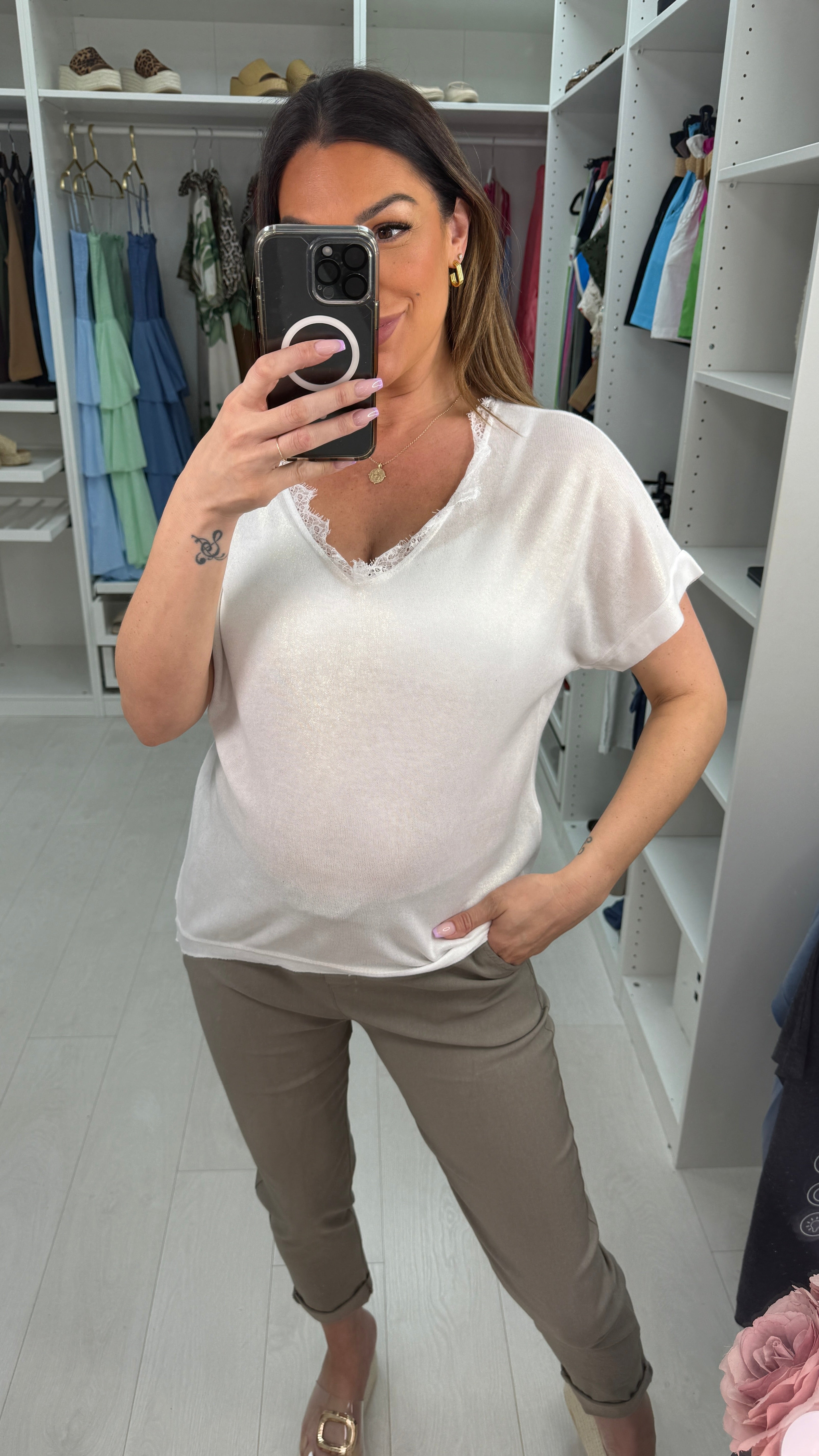 Elevate your everyday style with the Camryn Plain Lace Detail Lurex T-Shirt. Featuring a delicate lace V-neckline and flattering short sleeves, this top adds a touch of elegance to any outfit. The subtle lurex shimmer throughout creates a sophisticated shine, perfect for day-to-night wear. Comfortable and chic, it’s an effortless way to stand out with understated glamour.