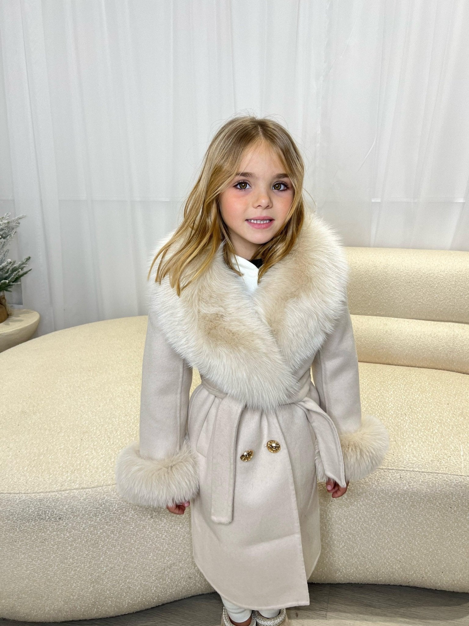 Keep your child cozy and warm with this luxurious coat. Crafted with premium cashmere and light beige fur, this coat is sure to have your child looking and feeling their best. Featuring shawl collar and two pockets, this garment keeps your child trendy and prevents any chill. Designed with breathability and warmth in mind, this plush coat is crafted with high-quality cashmere and light beige fur, providing comfort and style all winter long. The shawl collar and two pockets add both practicality and elegance to this luxurious garment that will have your child looking and feeling their best.