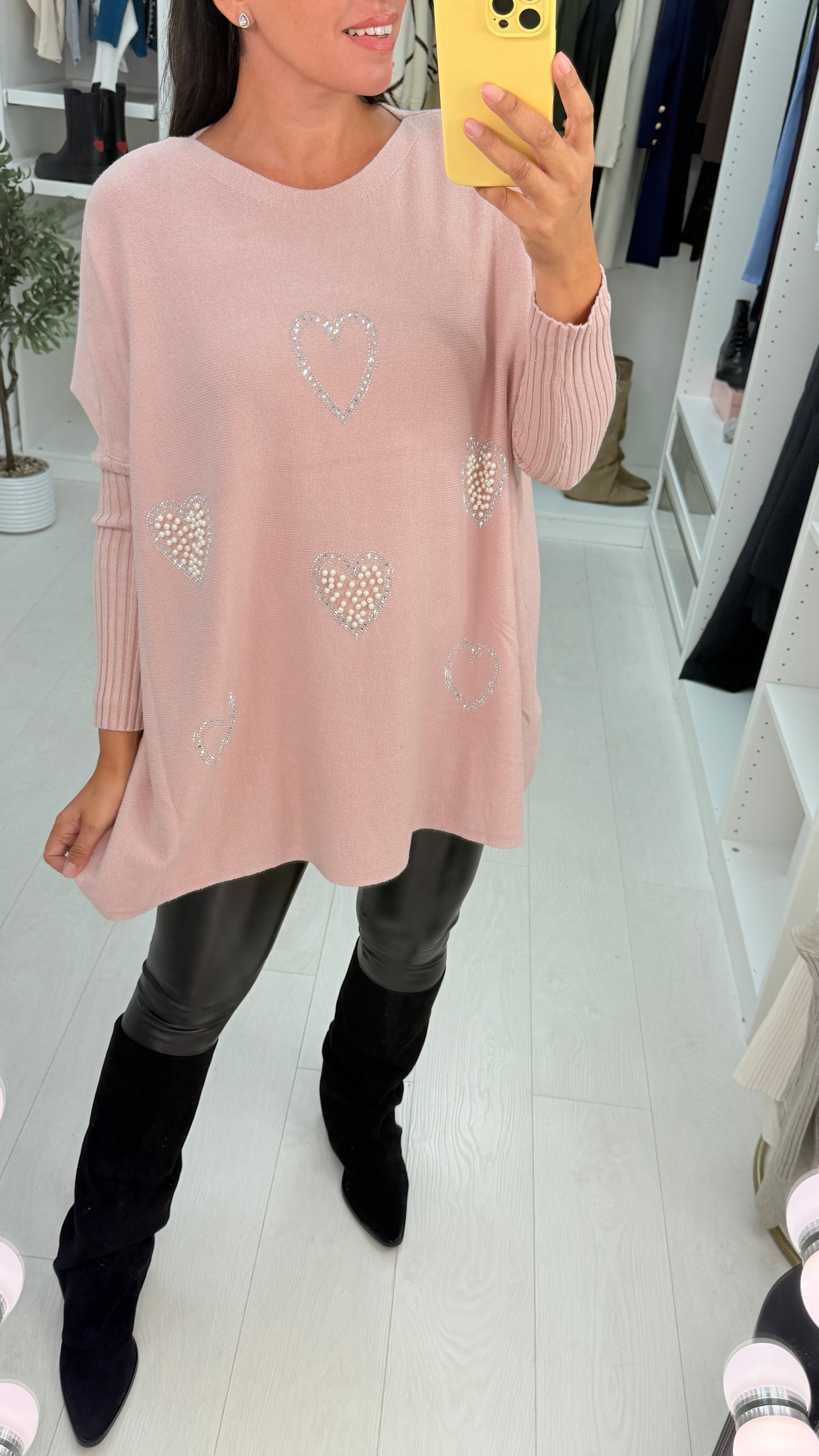 Embrace effortless style with the Darianna Embellished Heart Detailed Loose Fit Jumper. Crafted from soft ribbed knit, it offers a relaxed, comfortable fit with flattering batwing sleeves and fitted ribbed cuffs. The round neckline and dipped hem add subtle elegance, while the sparkling heart detail brings a touch of charm to your everyday look. Perfect for layering or wearing alone, this jumper effortlessly combines comfort and personality.