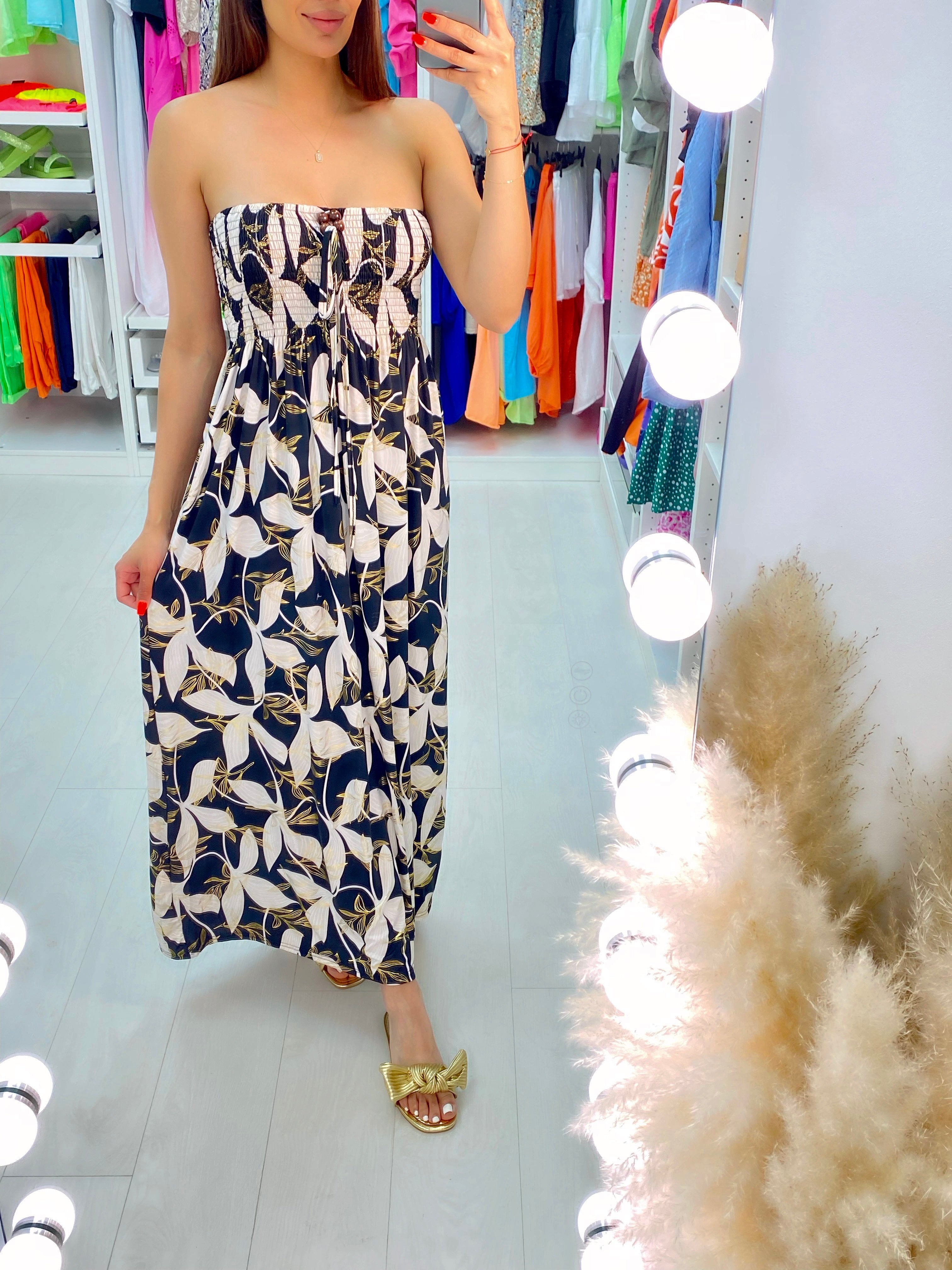 Elana Elasticated Bust Leaf Print Bandeau Maxi Dress