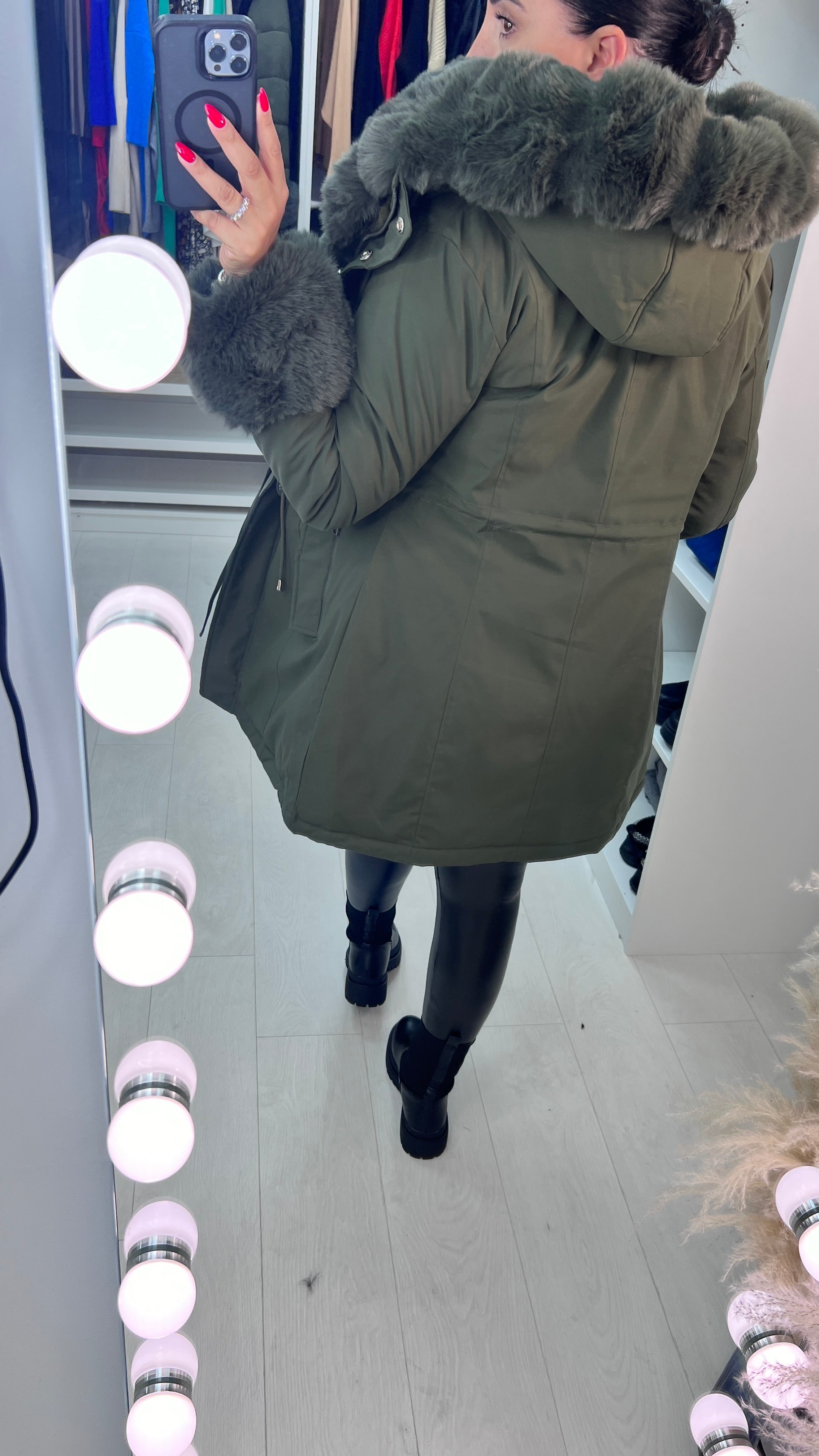 Jaya Khaki Faux Fur Hooded Toggle Coat