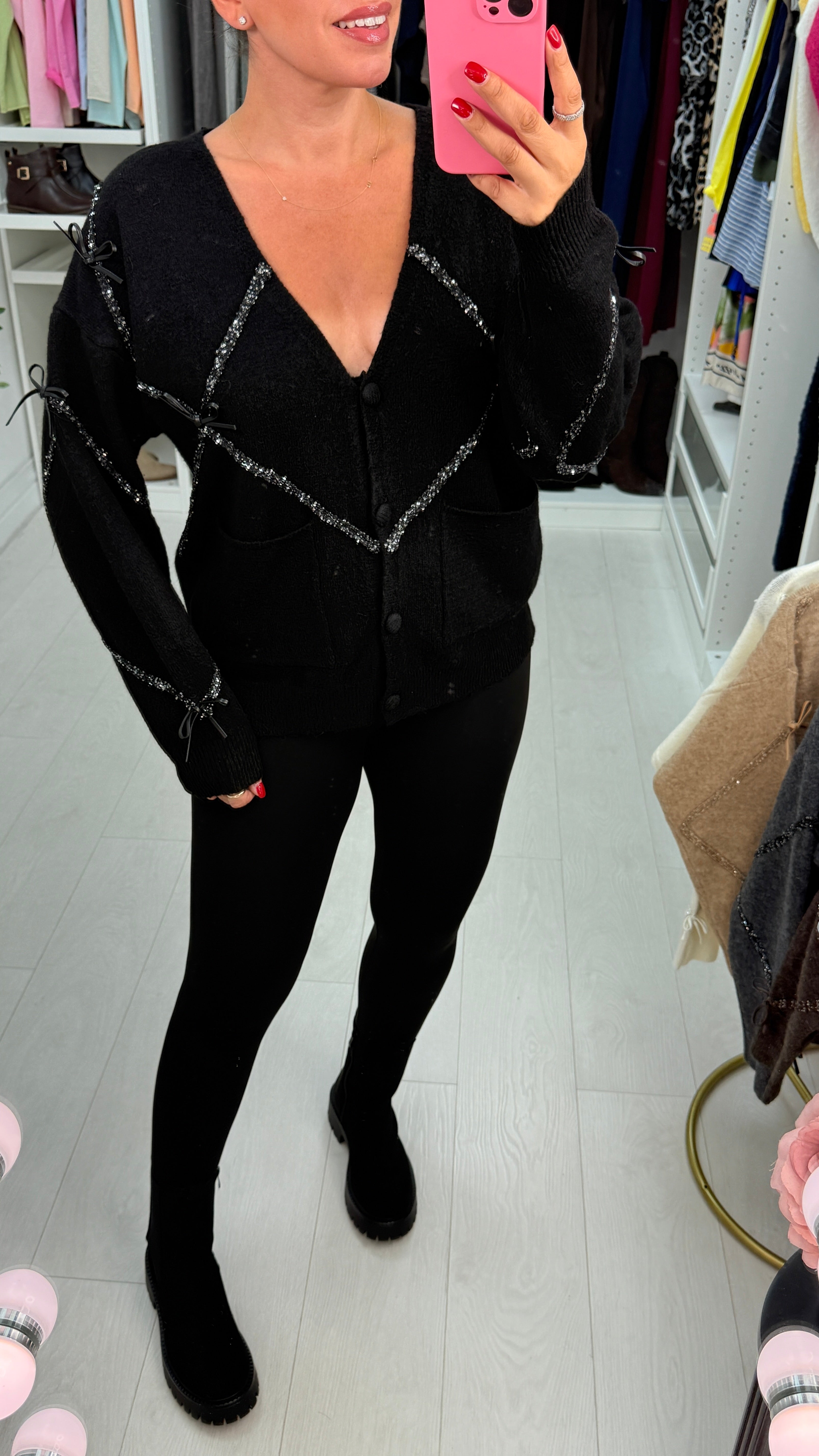 The Jayde Bow Detail Super Soft Cardigan offers unmatched comfort with its luxuriously soft fabric and long sleeves finished with ribbed cuffs for a perfect fit. Featuring elegant sequin and bow details, this button-front cardigan adds a subtle sparkle to your outfit. Practical pockets complete the design, making it both stylish and functional for everyday wear. Elevate your look with this charming and cozy essential.