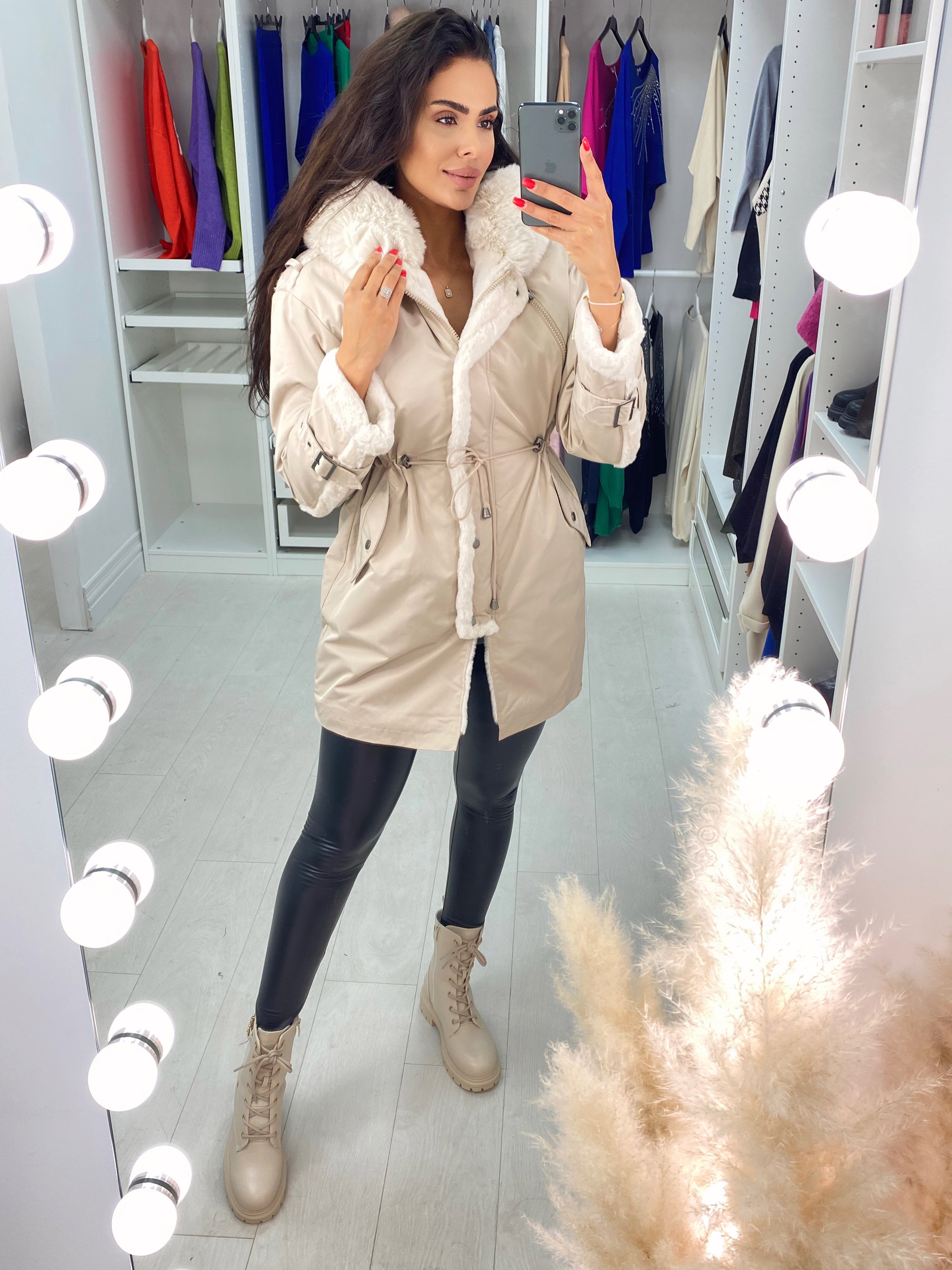 Kimzey Beige Lush Faux Fur Hooded Coat