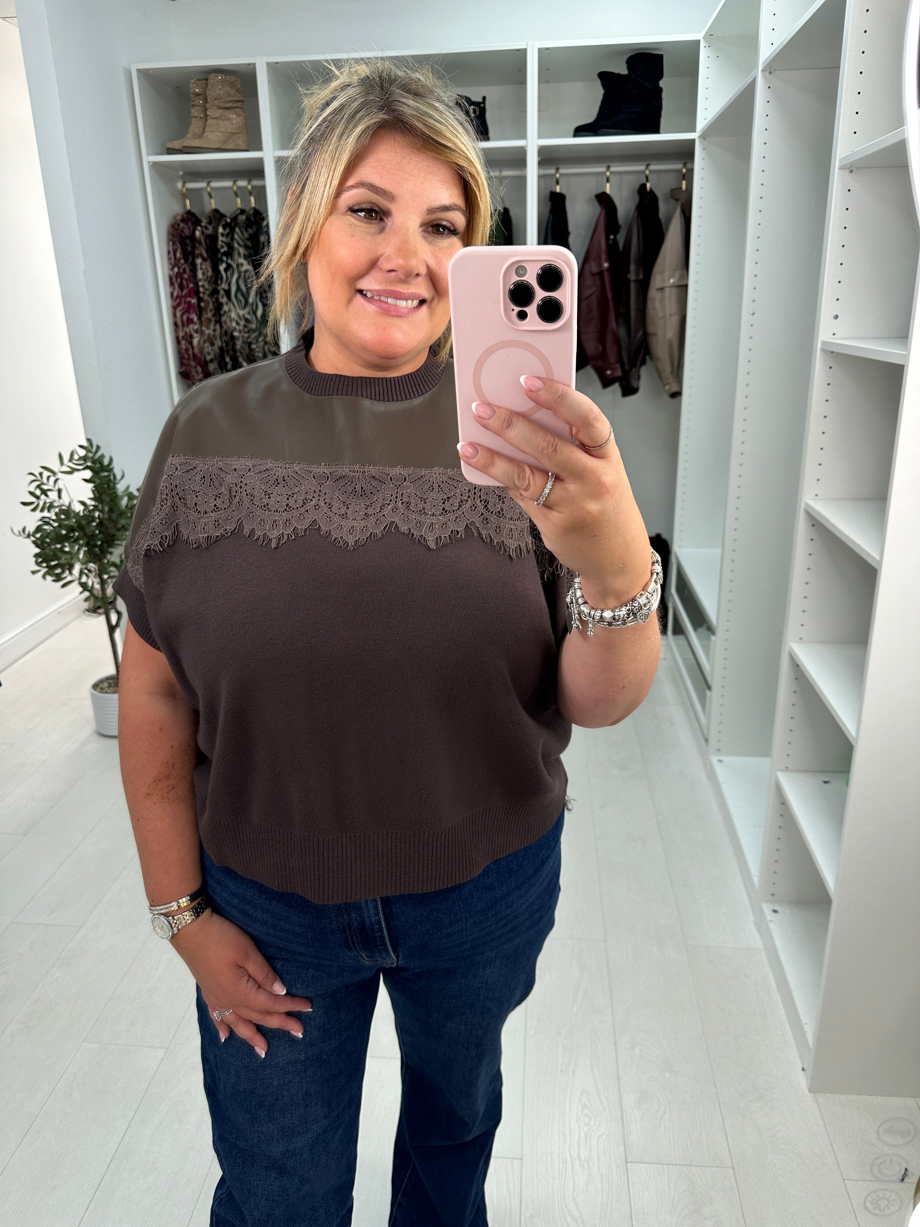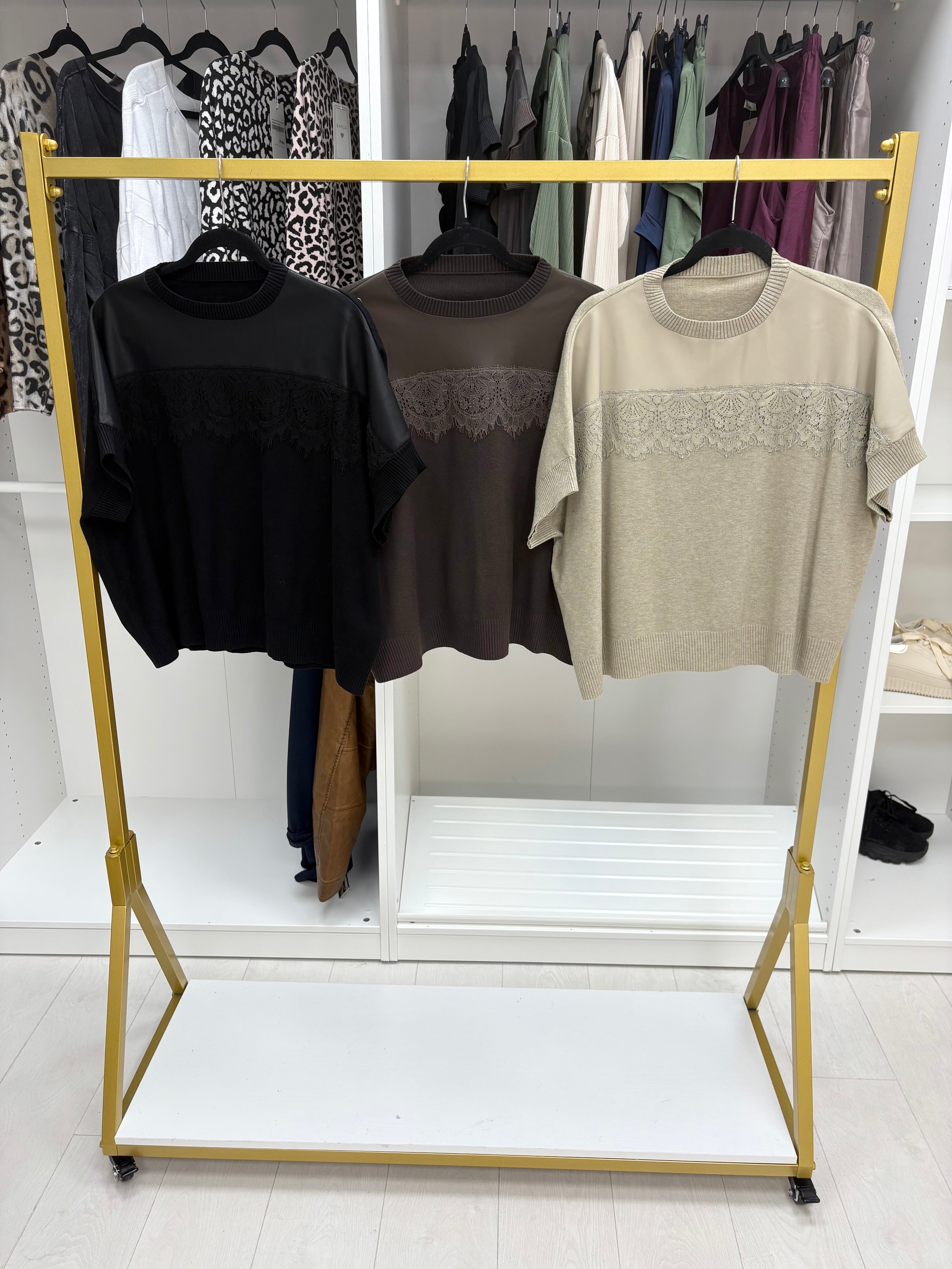 Elevate your wardrobe with the Laney Faux Leather & Lace Detailed Jumper. Featuring chic faux leather and delicate lace paneling, this short-sleeve jumper offers a stylish round neck and a comfortable ribbed hem. Perfect for dressing up or down, it effortlessly blends edgy sophistication with everyday ease.