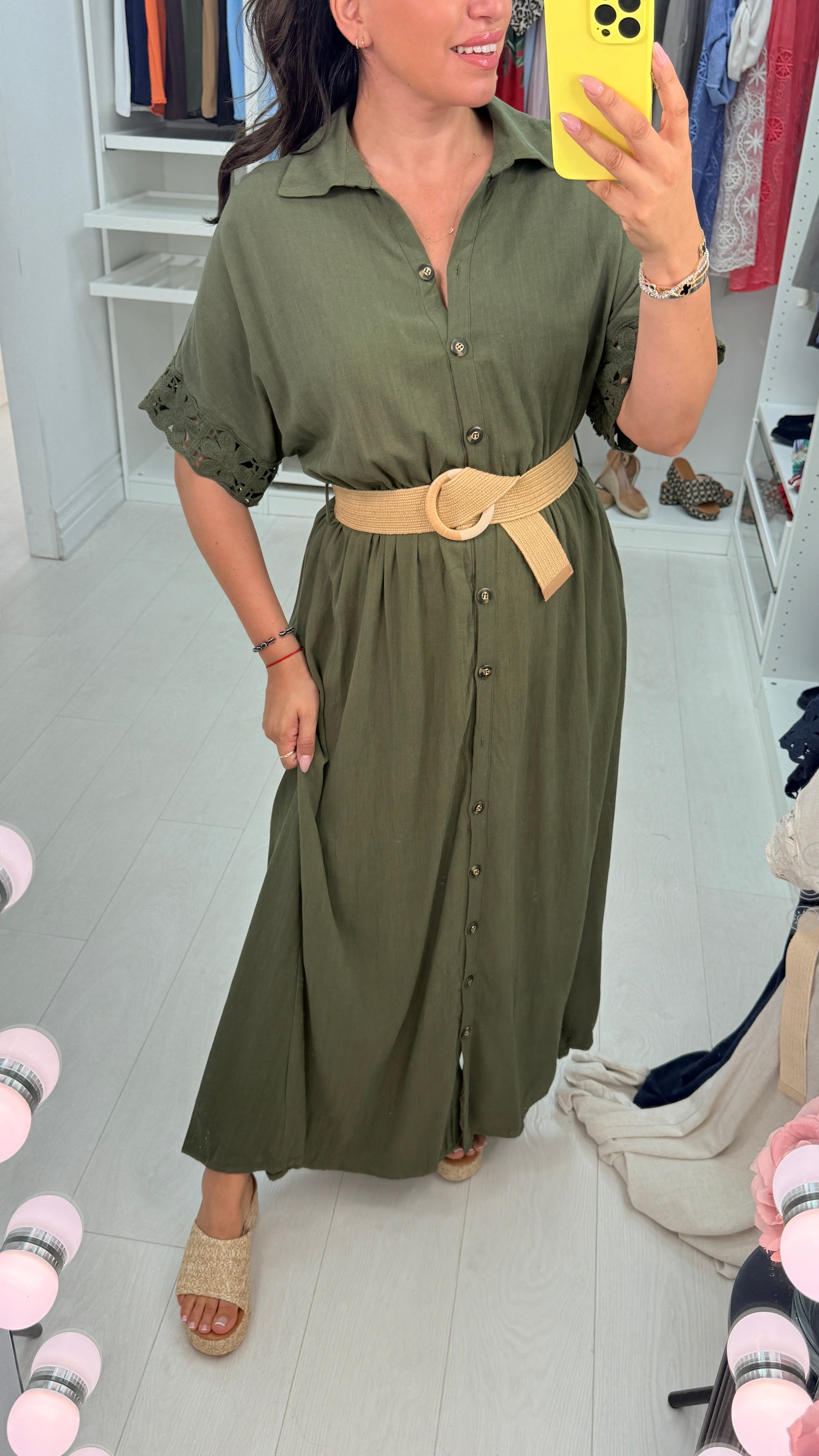 Experience effortless elegance with the Lavina Plain Linen Crochet Detail Belted Maxi Dress. Crafted from breathable linen, it features delicate crochet accents on the short sleeves and a classic collar for a refined touch. The button-front design and elasticated waist ensure a flattering fit, while the woven elasticated belt adds shape and style. Perfect for warm days, this maxi dress combines comfort and sophistication in one versatile piece.