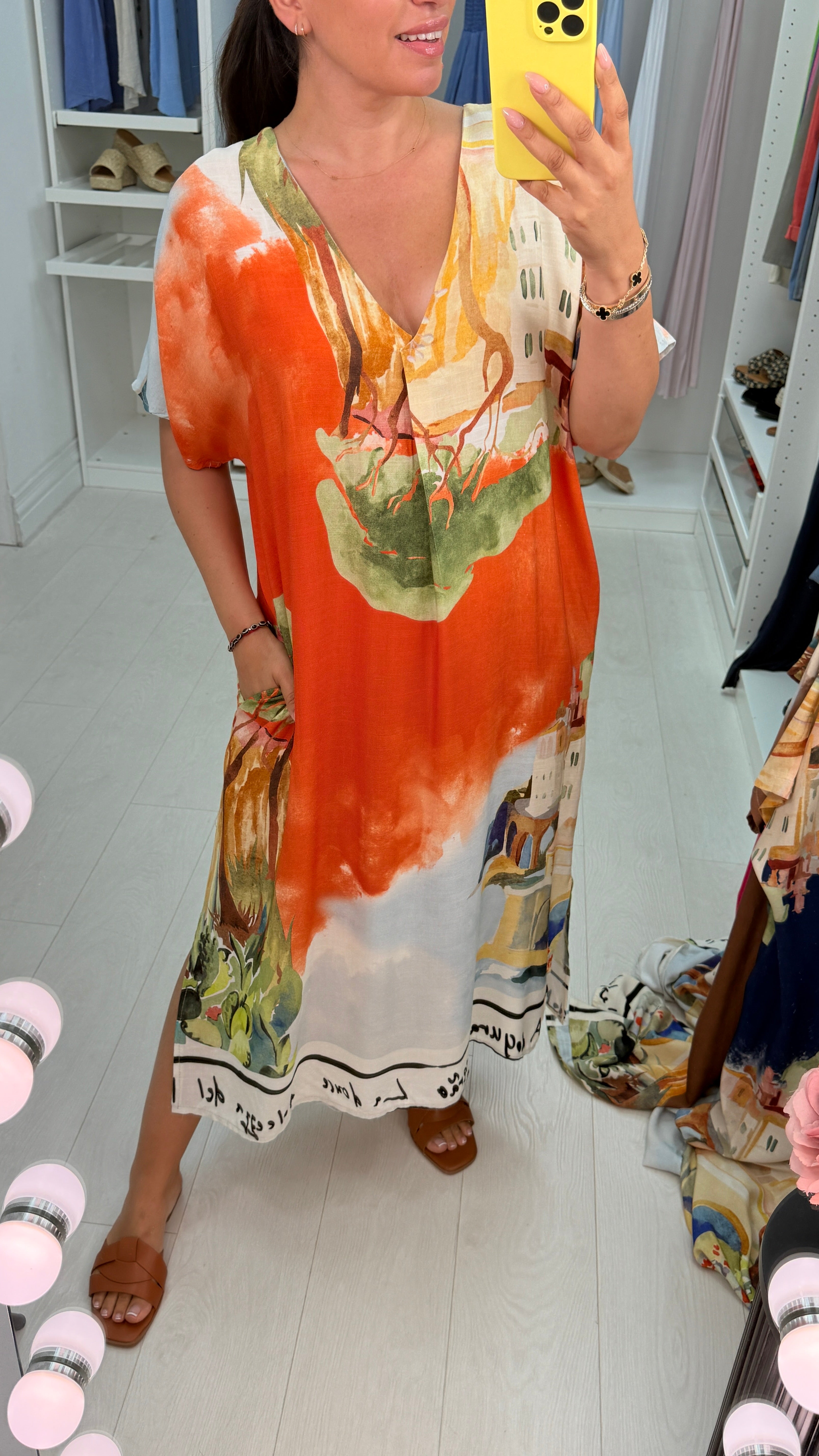 Experience effortless elegance with the Liana Printed V Neck Loose Fit Maxi Dress. Featuring a captivating building and sea scenery print, this lightweight maxi offers a relaxed fit and flattering V neckline, perfect for warm days and breezy evenings. Its flowing silhouette ensures comfort without compromising style, making it an ideal choice for both casual outings and special occasions. Embrace a blend of artful design and breathable fabric that moves with you throughout your day, plus it has pockets!