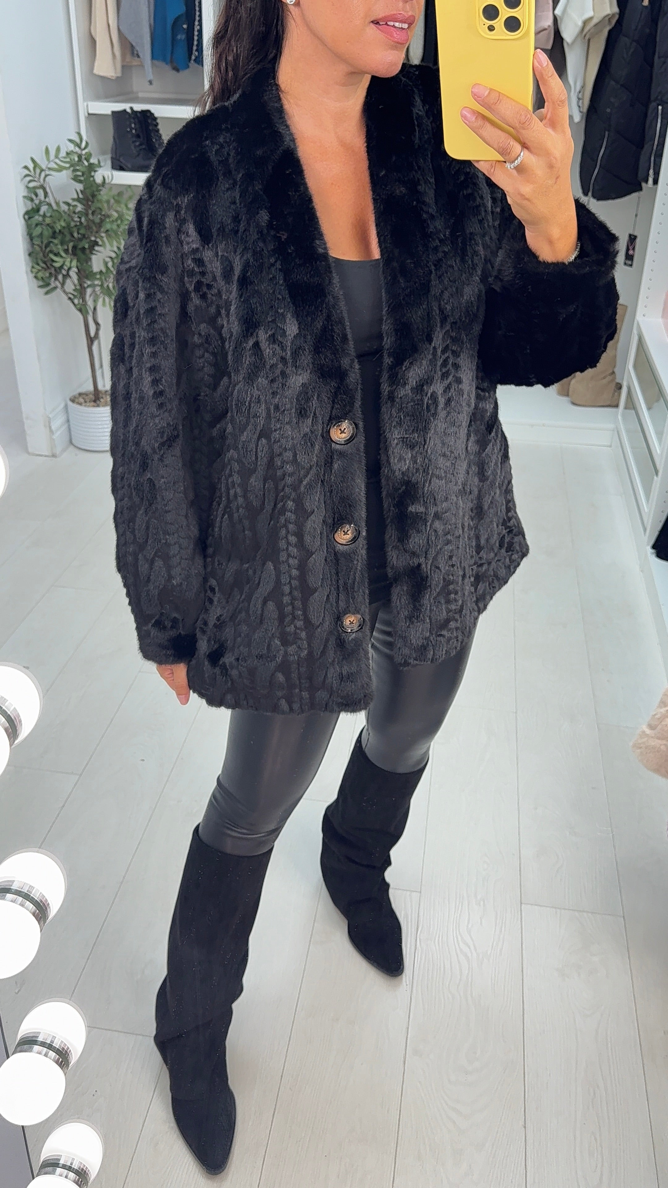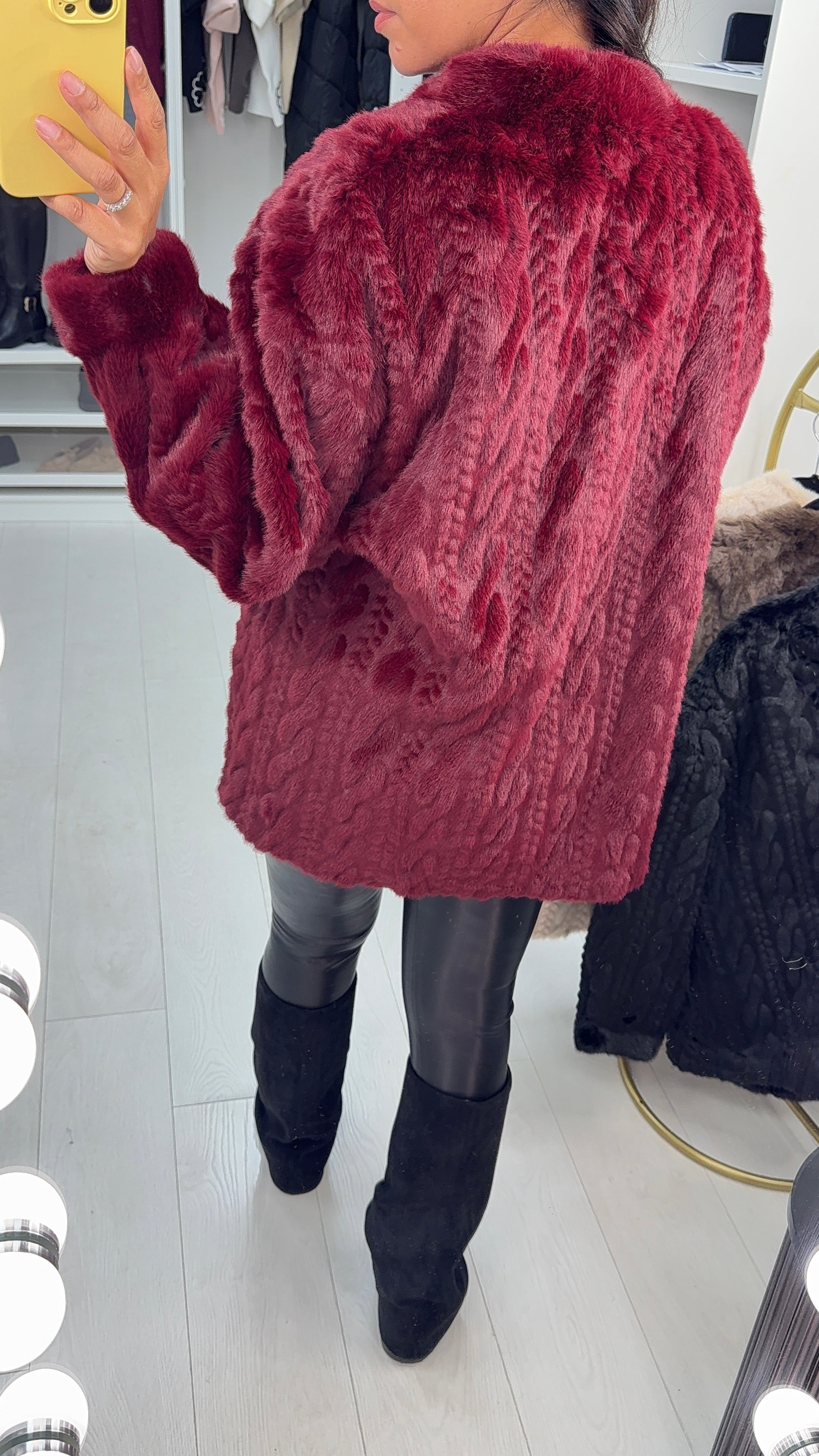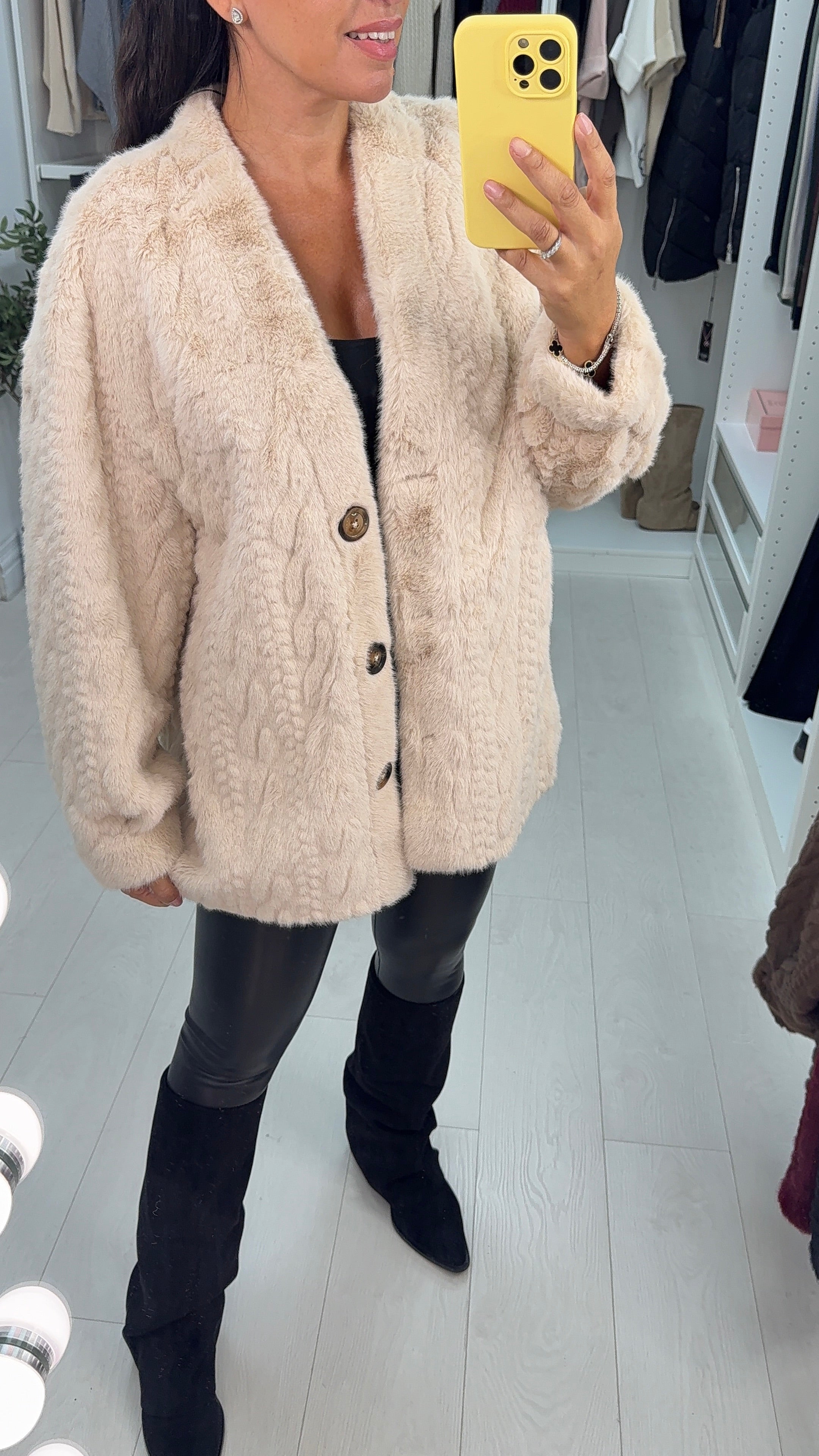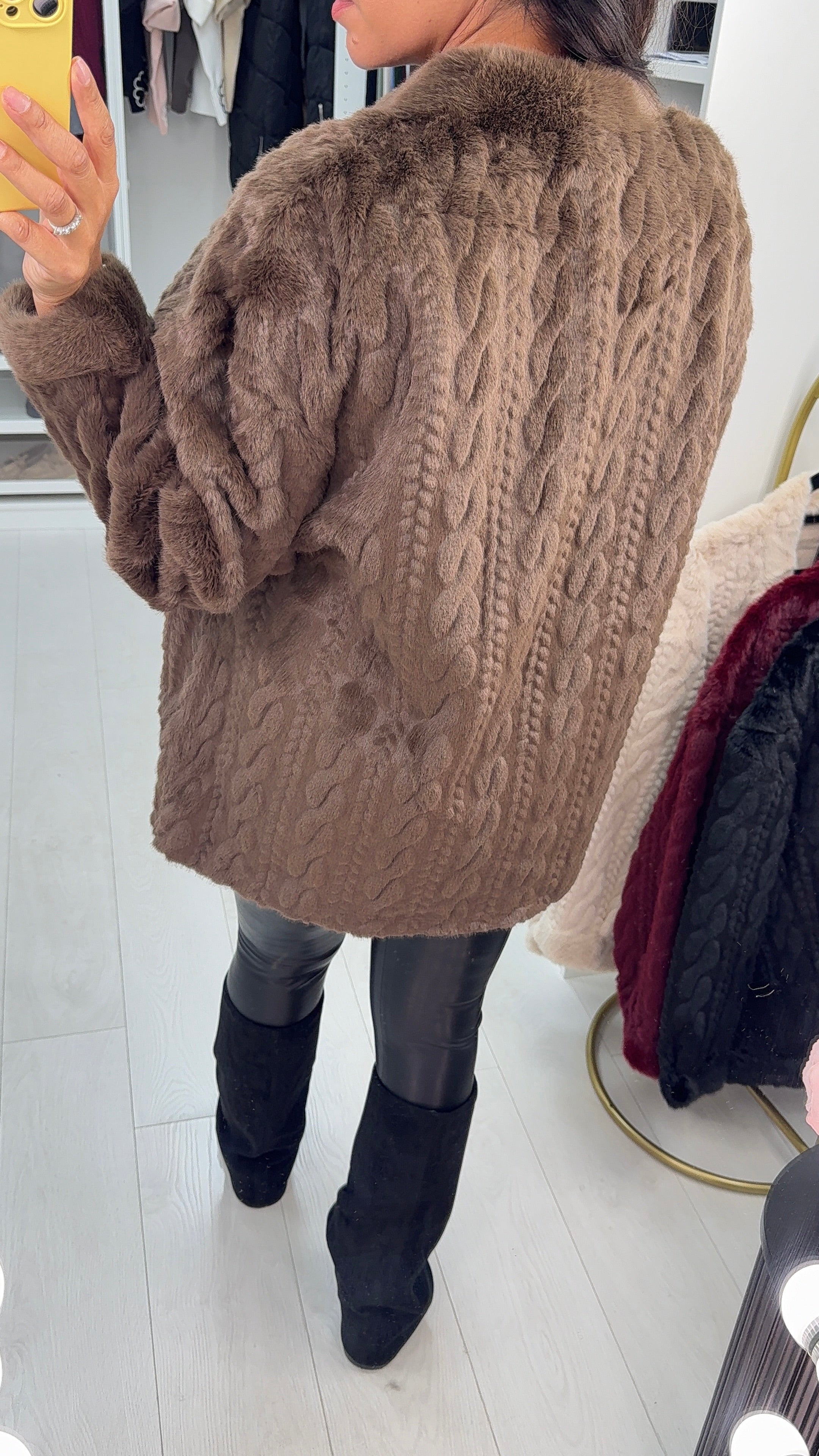 Wrap yourself in cozy luxury with the Marigold Faux Fur Coat. Featuring a playful cable knit design and a snug faux suede interior, this coat offers warmth and style in one.  Practical side pockets keep your hands warm or hold your essentials. Perfect for chilly days when you want to look fabulous and feel snuggly!