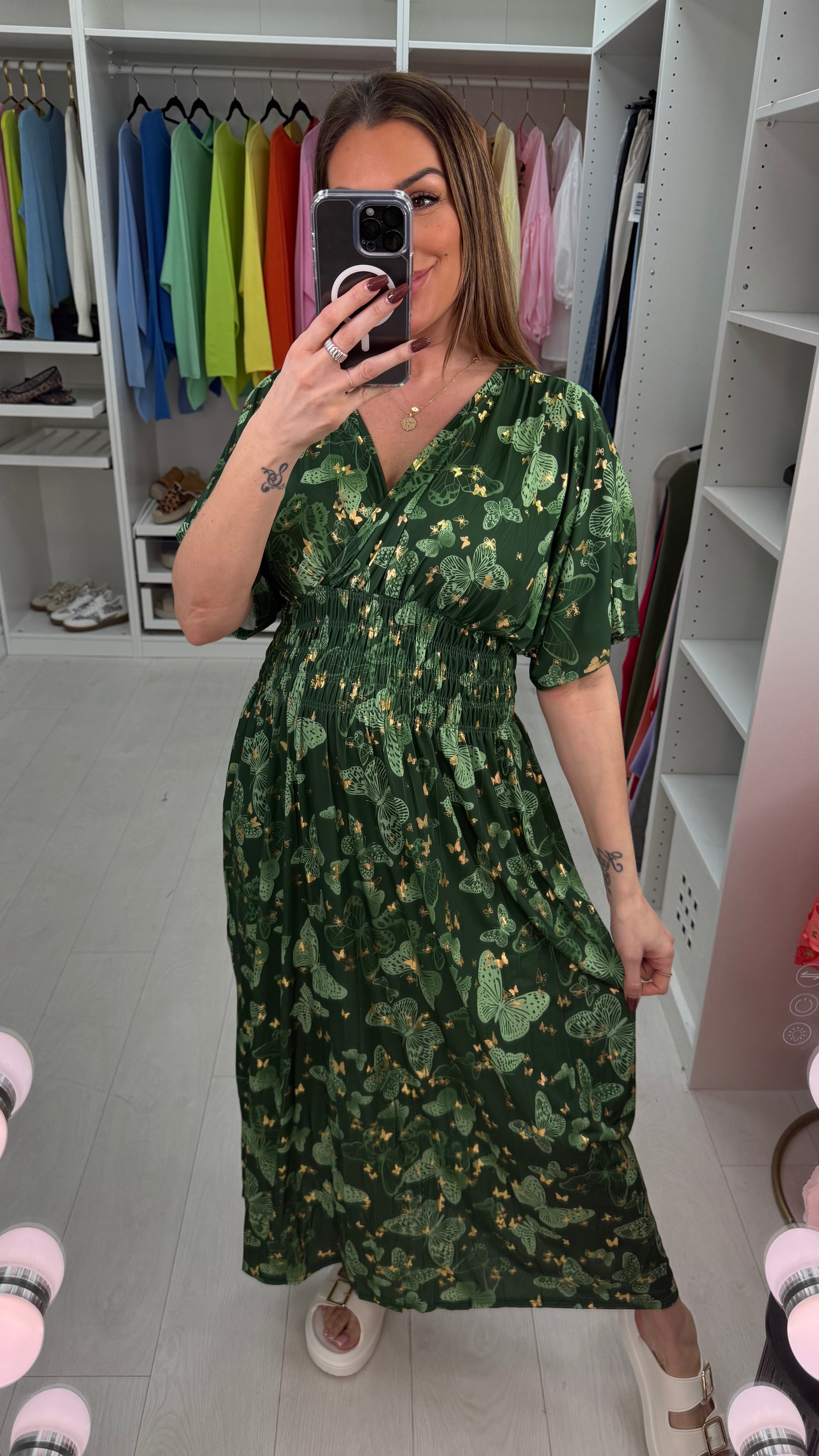 Nancie Butterly Print Shirred Waist Magic Maxi Dress
