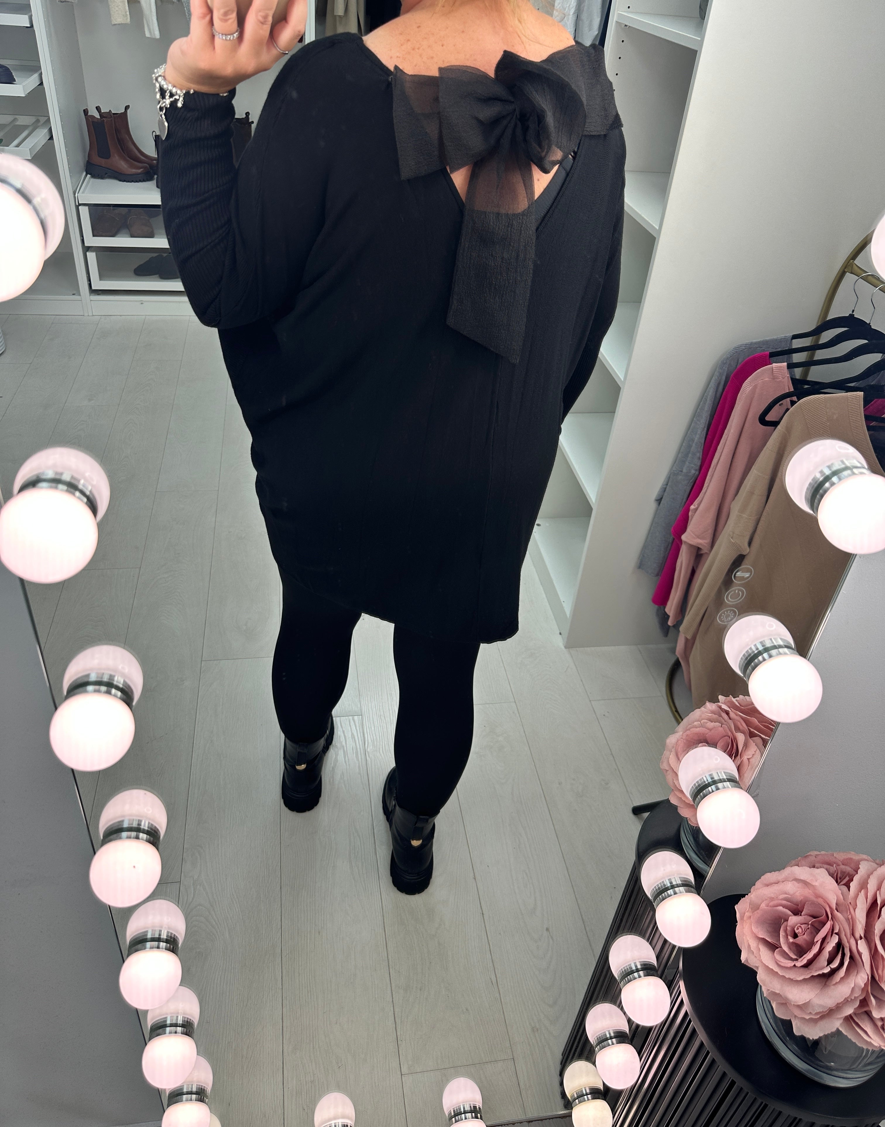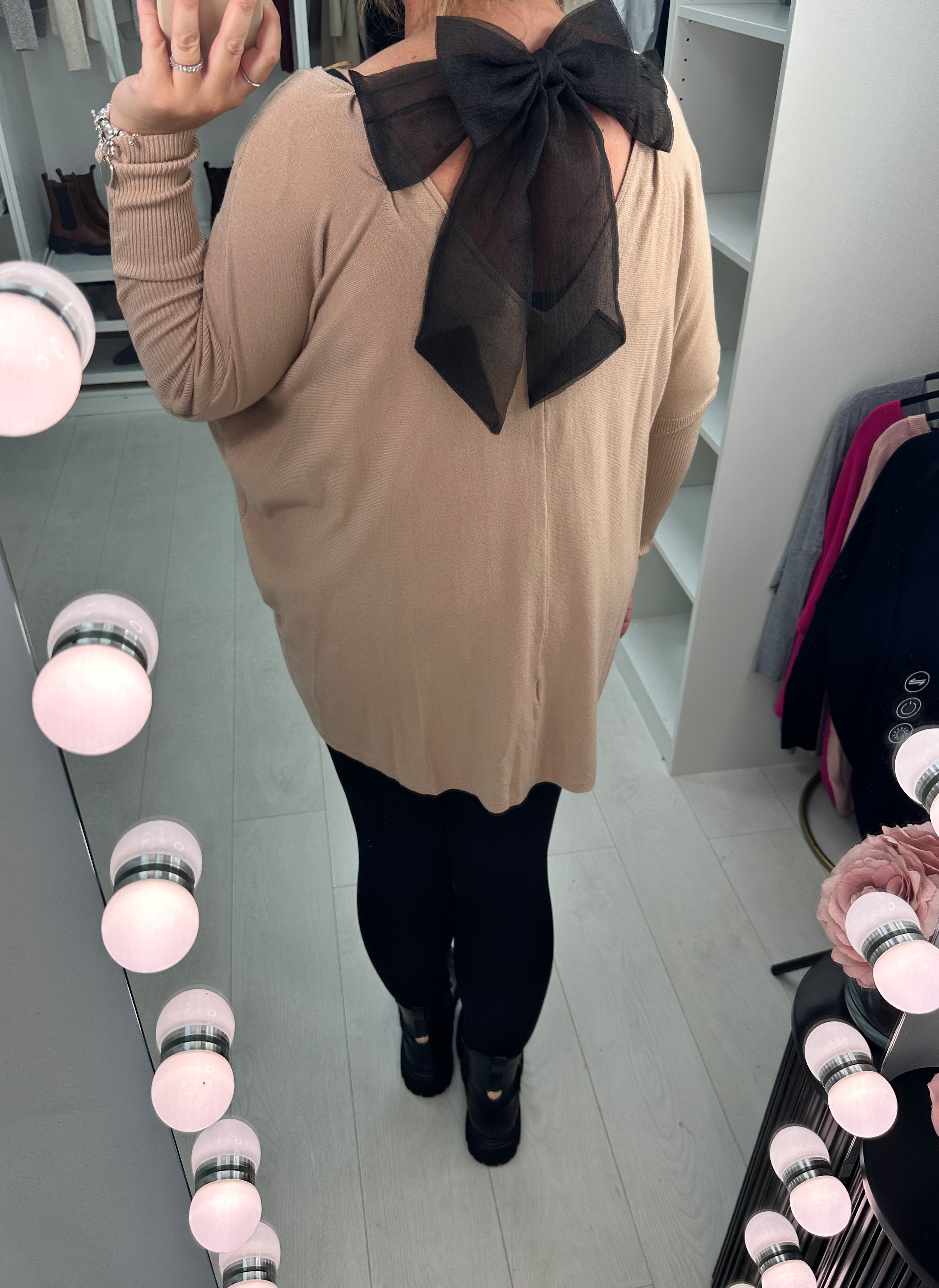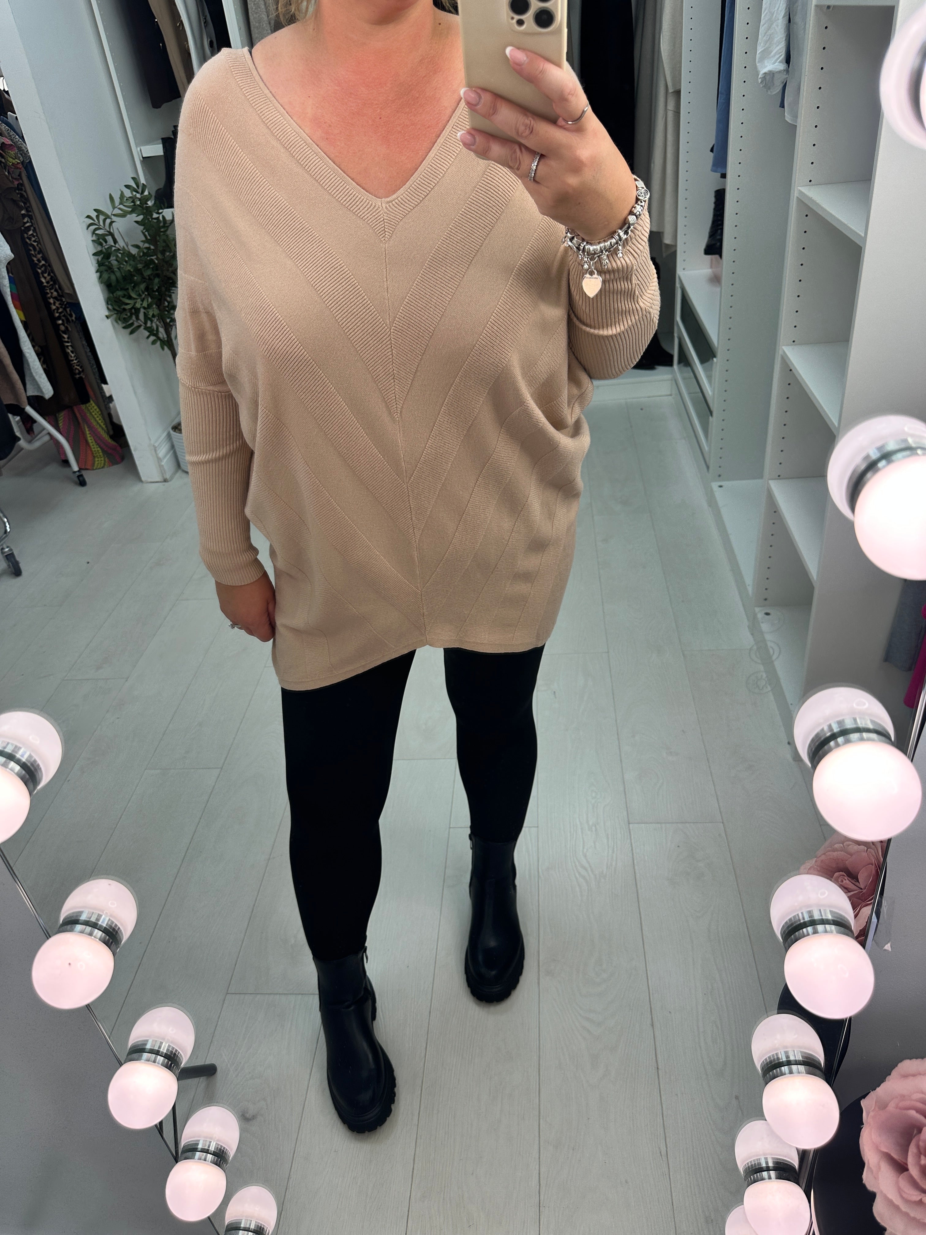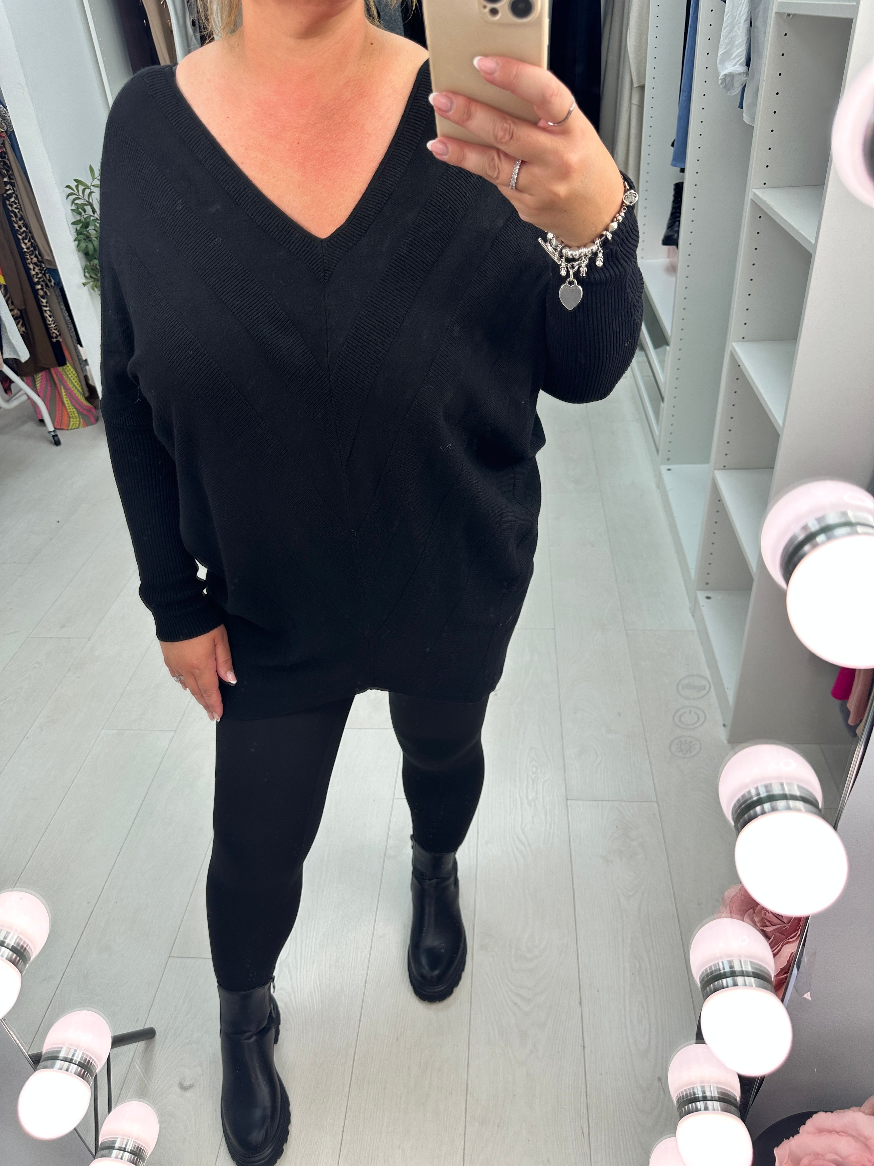 Elevate your wardrobe with the Reeva Plain Asymmetric Bow Back Jumper. Featuring a flattering plain V-neck and a stylish asymmetric front design, this longline jumper offers a modern twist on classic comfort. The long batwing sleeves with ribbed cuffs add effortless elegance, while the delicate bow detail at the back creates a charming, feminine finish. Perfect for layering or wearing alone, this jumper combines unique style with cozy wearability.