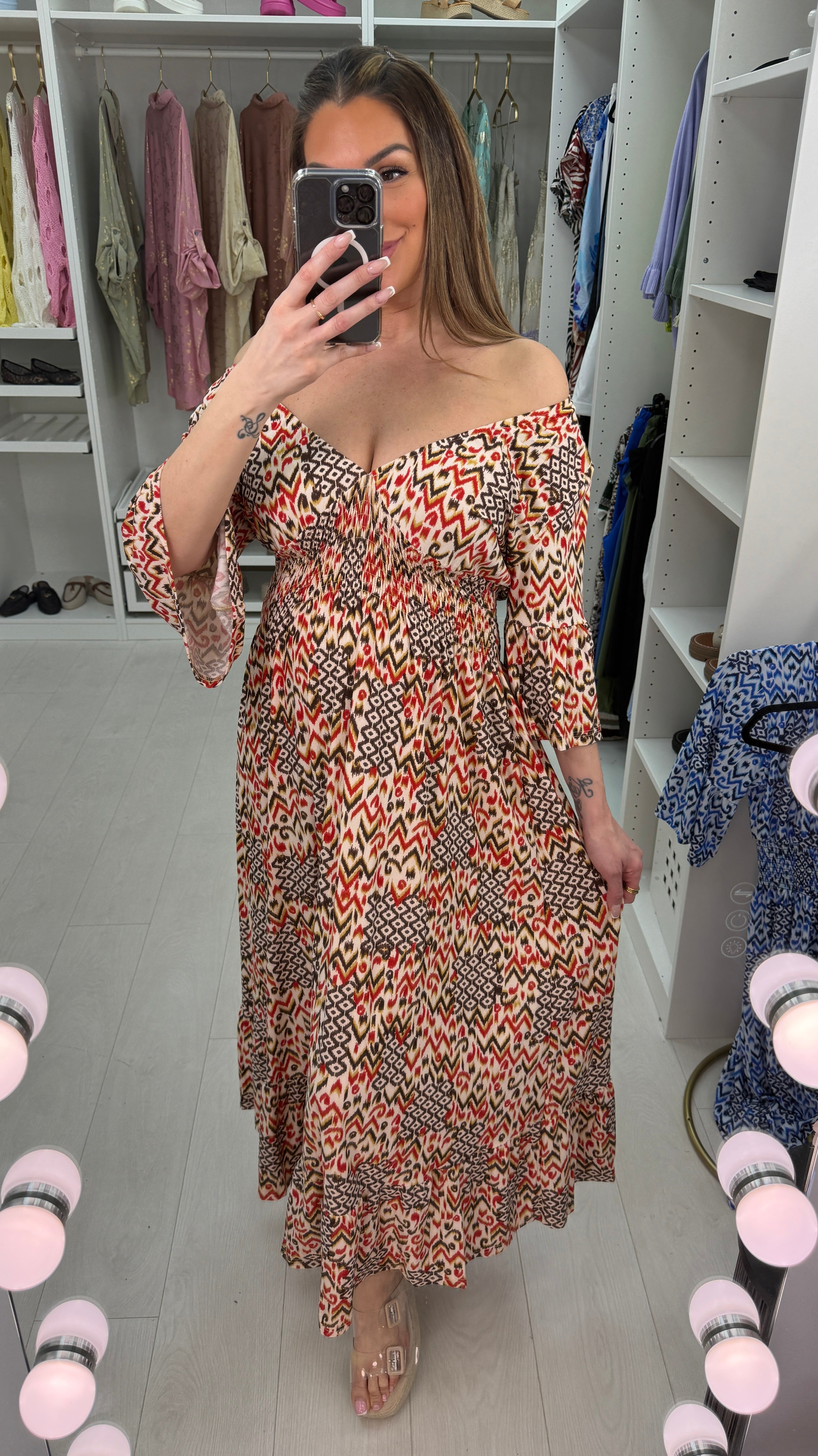 Scarlet Aztec Print Shirred Waist Magic Maxi Dress