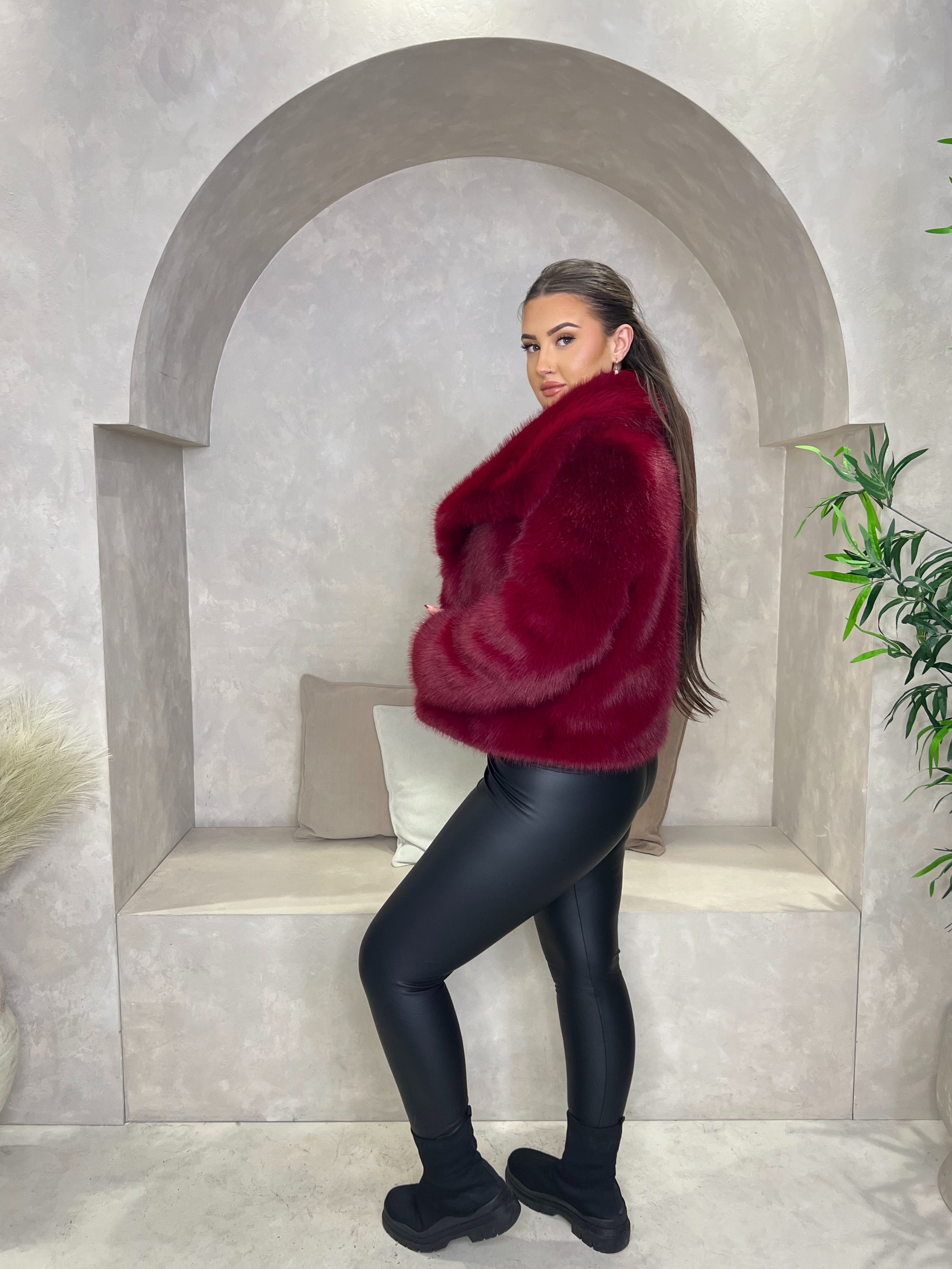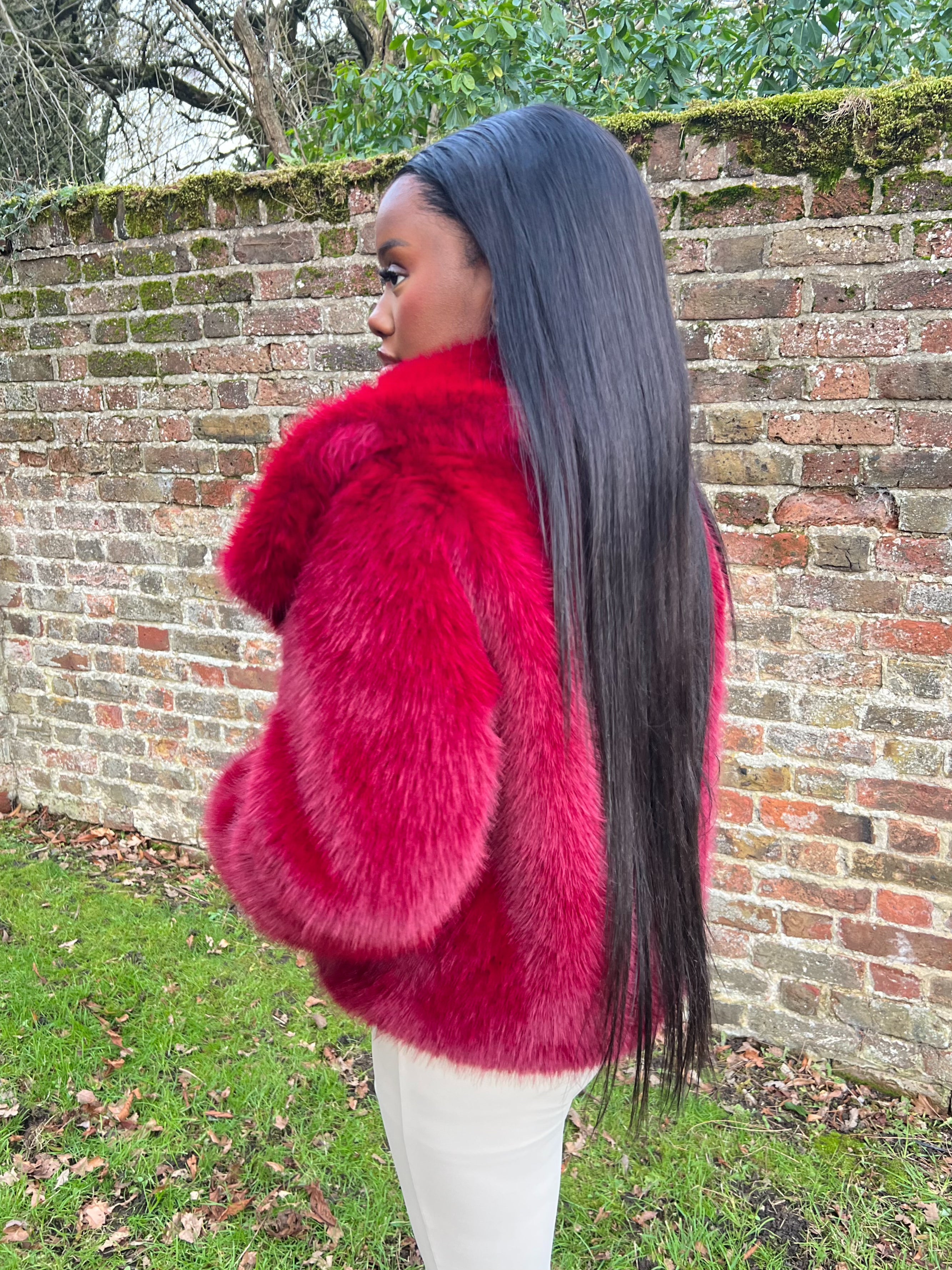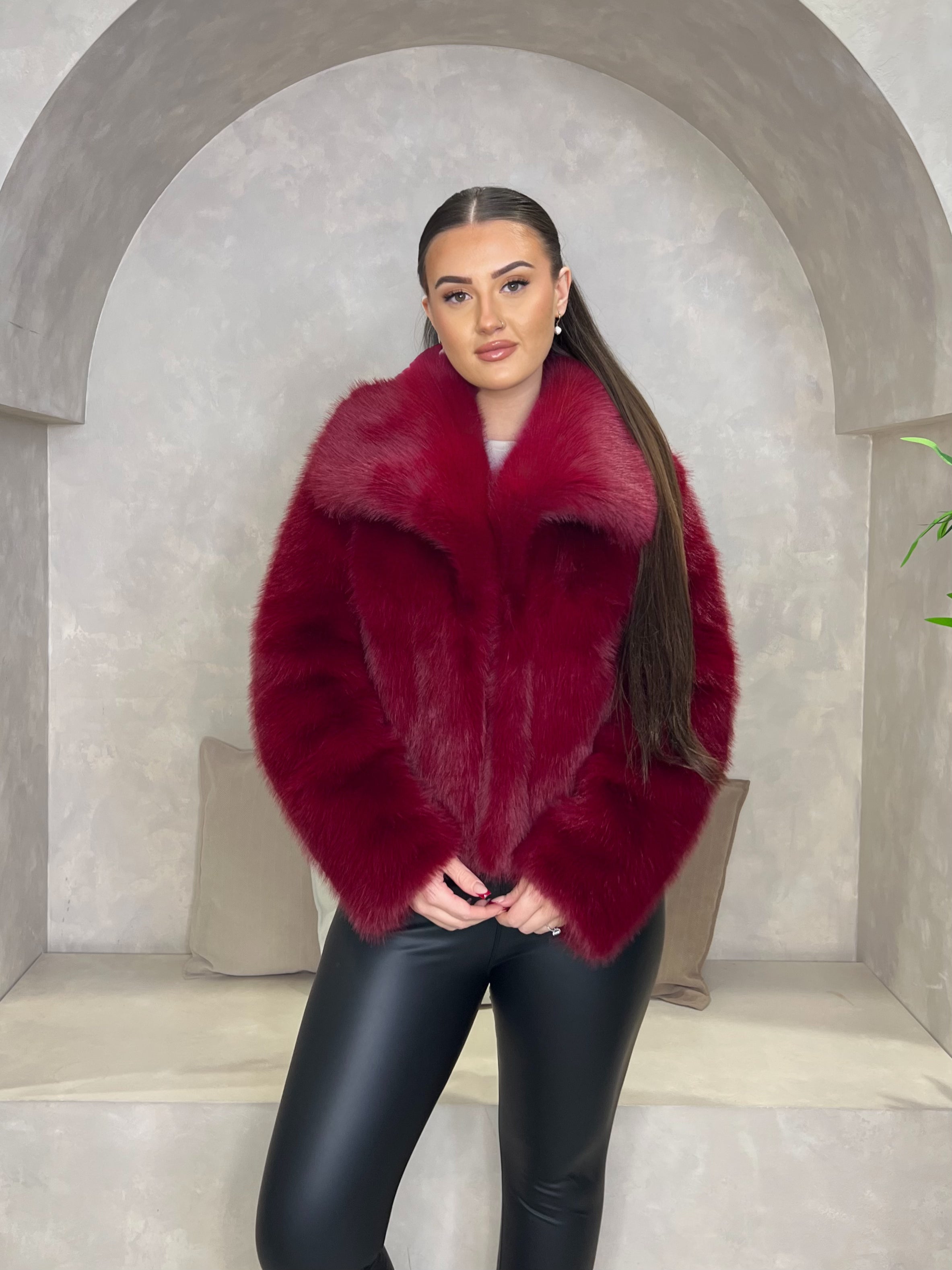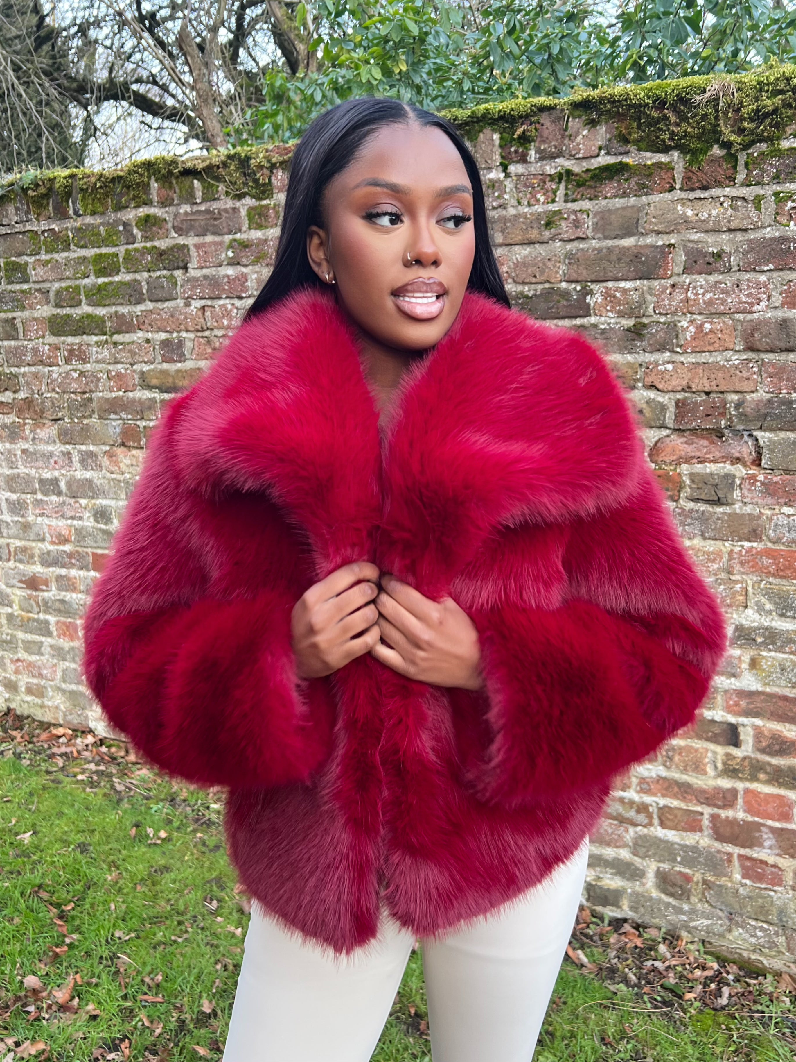 Expertly crafted with a large, luxurious collar and long sleeves for warmth and style. Made from premium faux fur, this elegant jacket is both fashionable and functional. Fastens securely with a hook and eye closure. Stay stylish and cozy this season with our Premium Faux Fur Collared Jacket.