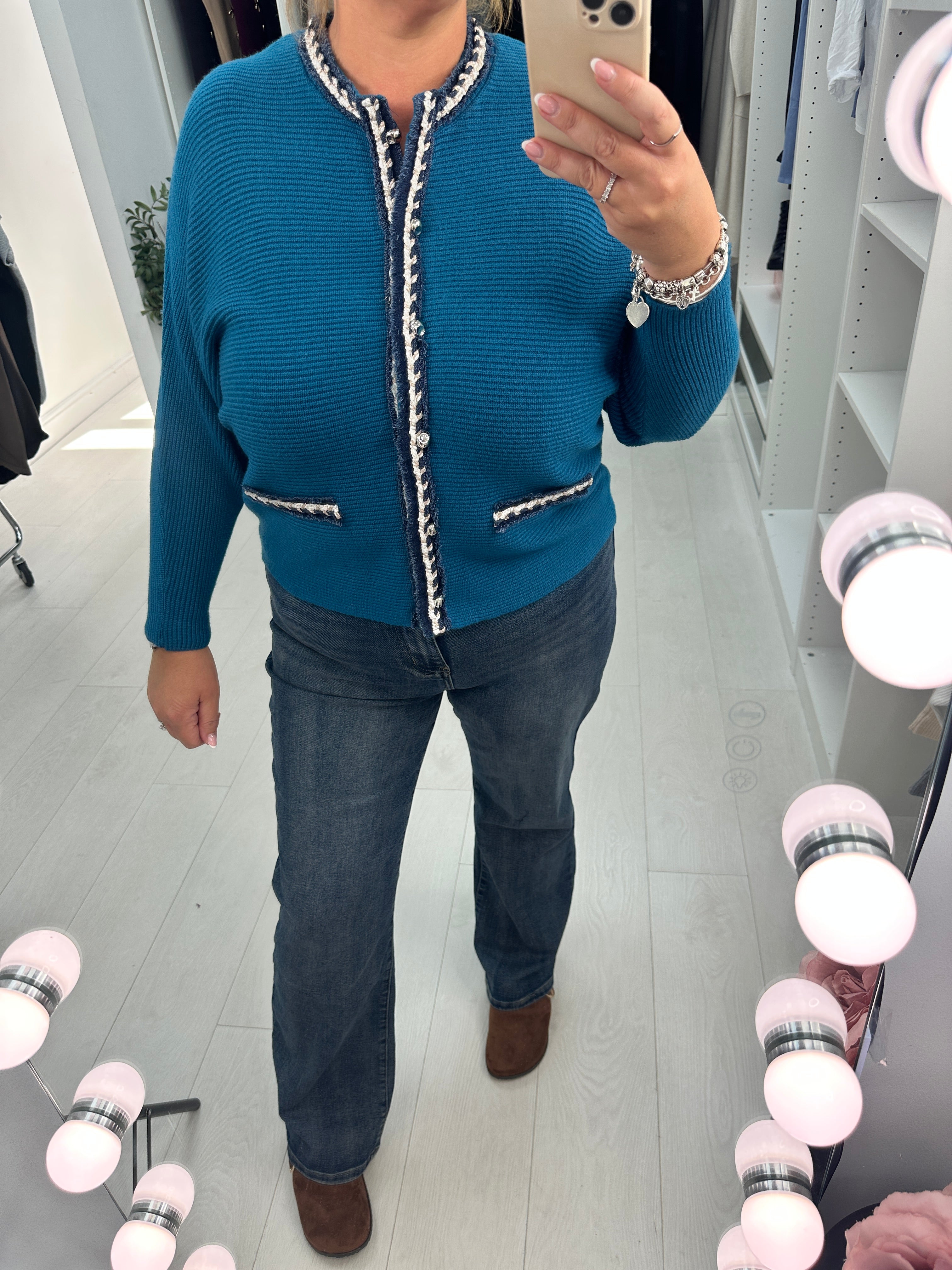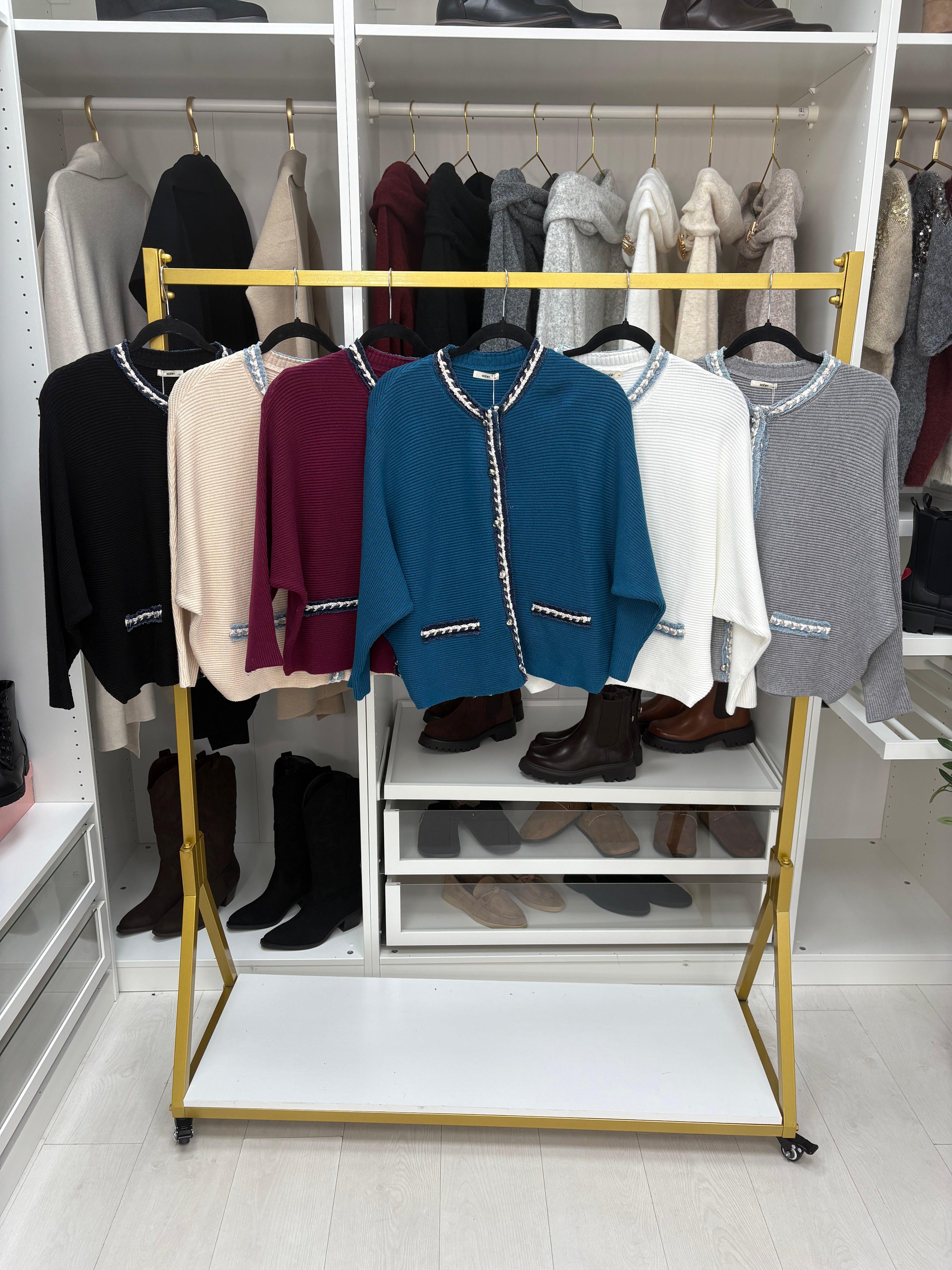 Elevate your wardrobe with the Yvonne Plain Denim Trim Knitted Cardigan. Featuring a comfortable ribbed texture and stylish denim trim, this cardigan offers a modern twist on a classic design. The round neck and batwing sleeves provide a flattering fit, while the functioning button closure adds practicality. Perfect for layering, it combines casual charm with versatile style to keep you looking effortlessly chic.