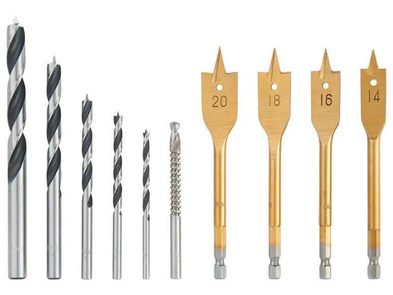 - 4 mèches à bois plates (Ø 14-16-18-20 mm)