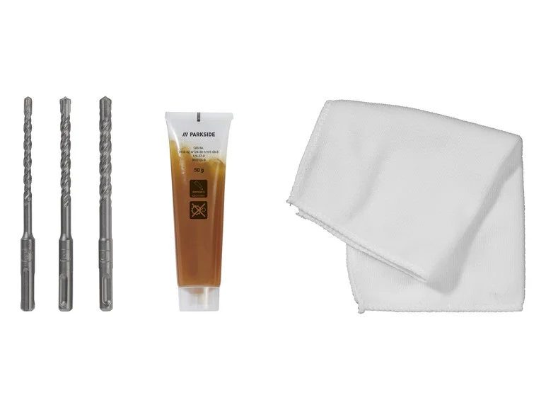 Accessoires inclus : 1 poignée supplémentaire, 1 butée de profondeur, 3 forets (6, 8 et 10 mm), 1 tube de graisse, 1 chiffon