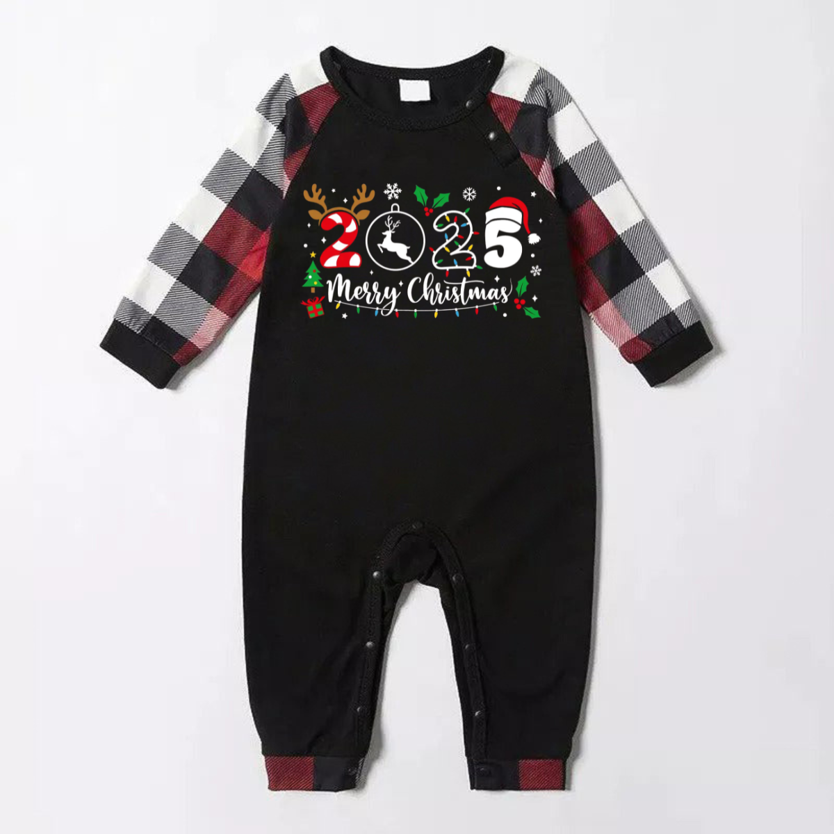 • "2026 Merry Christmas" Text Snowflake Printed Pattern - Black Top with Red&Black&White Plaid Sleeves - Family Matching Pajamas