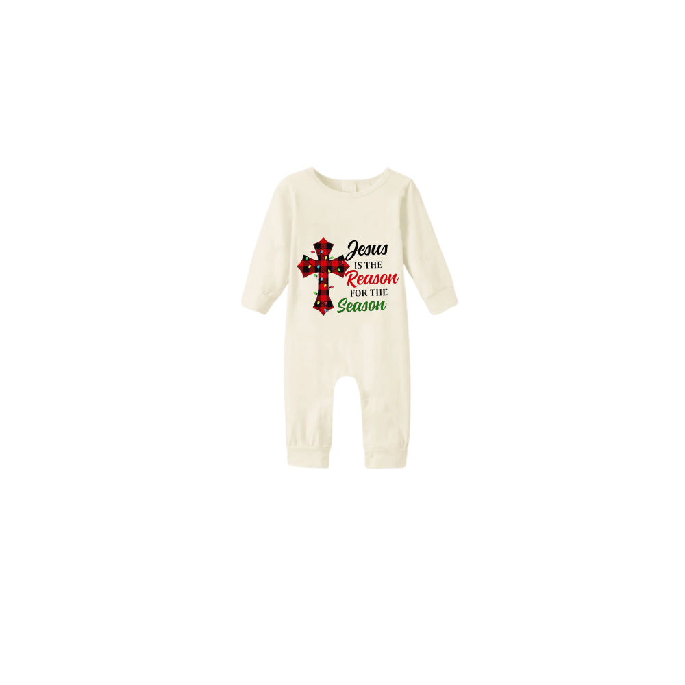 • Beige Christmas Pattern Print Christmas Pajamas Set With "Jesus Is The Reason For The Season" Slogan Print