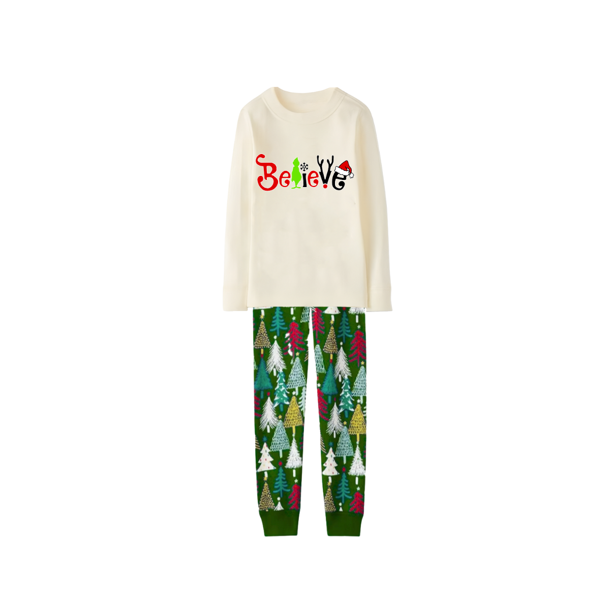 • Believe Letter Print Family Pajamas Set - Cream Top, Green Pants, Christmas Tree Pattern