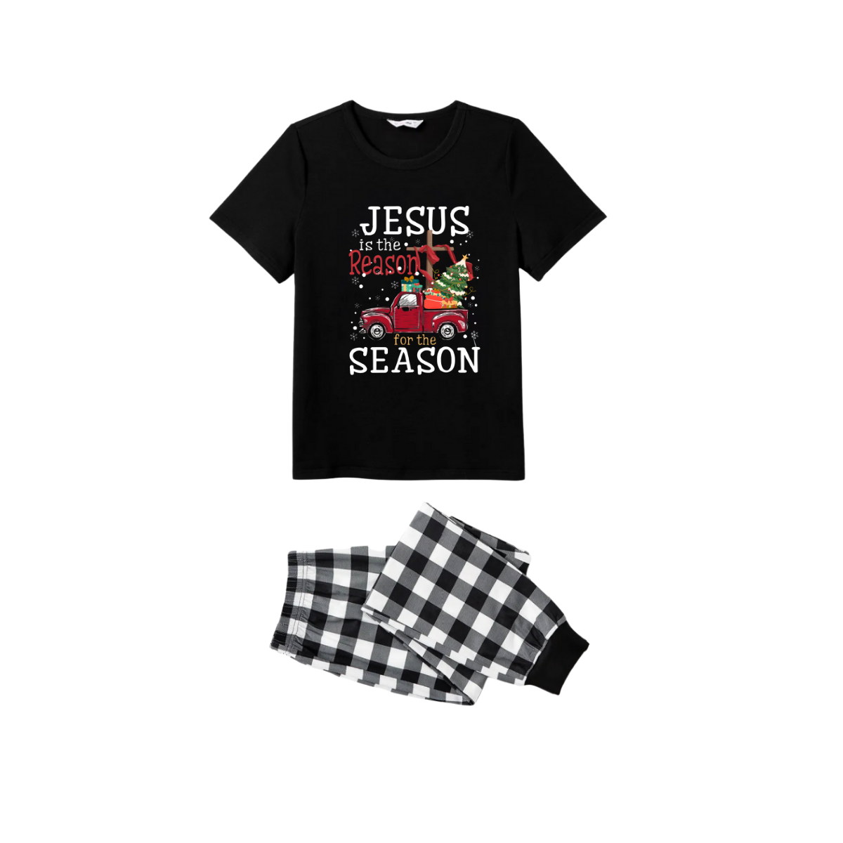 • Couple Black and White Plaid Christmas Short Sleeve Pajamas Set With "Jesus is the Reason for the Season" Text Print