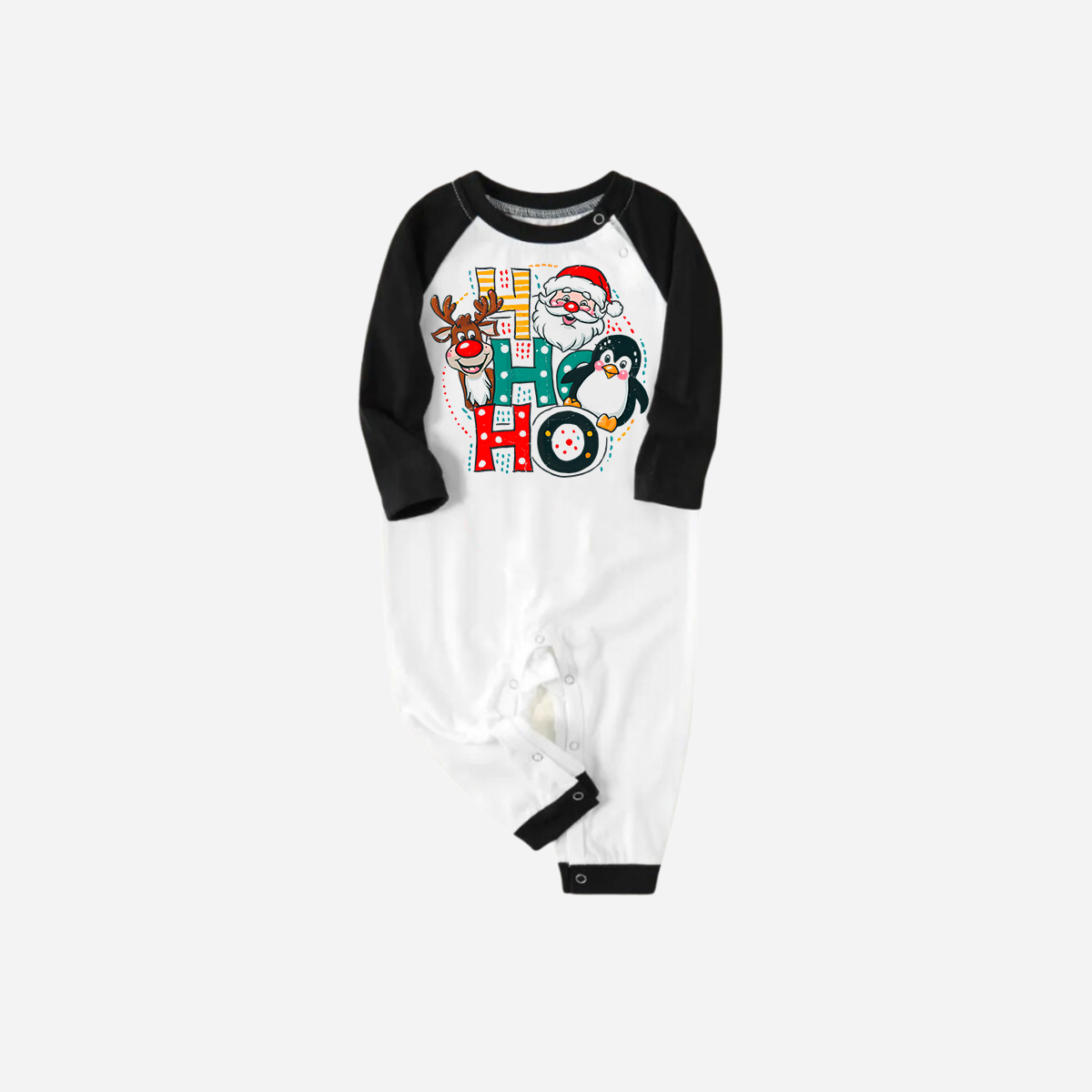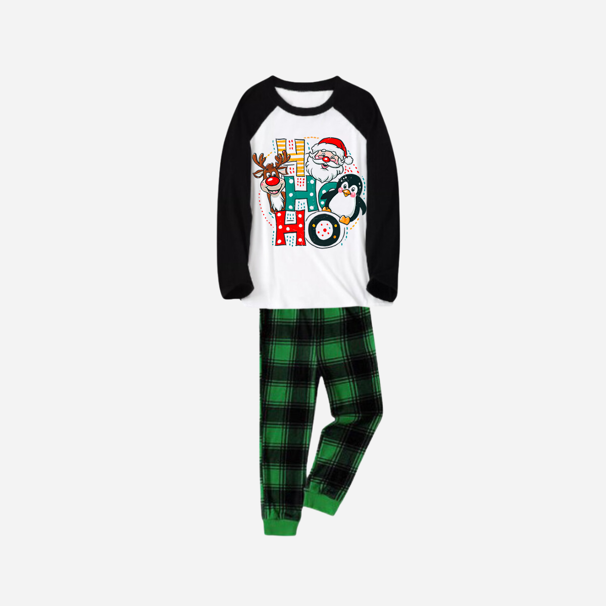 • Black Raglan Top Green Plaid Christmas Pajamas Set With "HO HO HO" Pattern Print