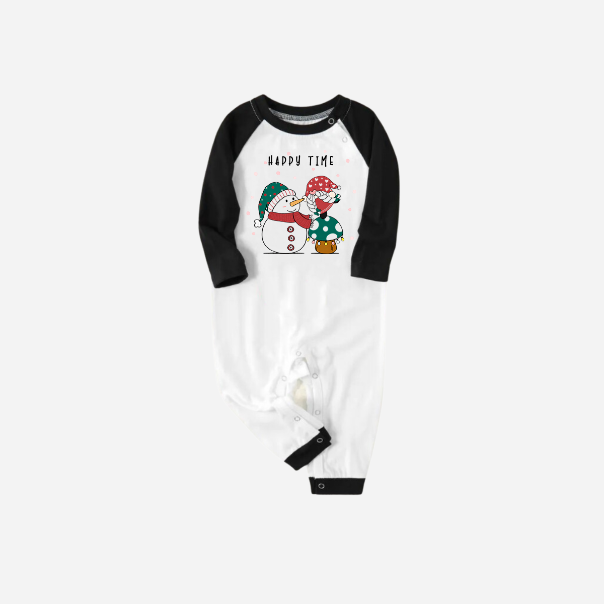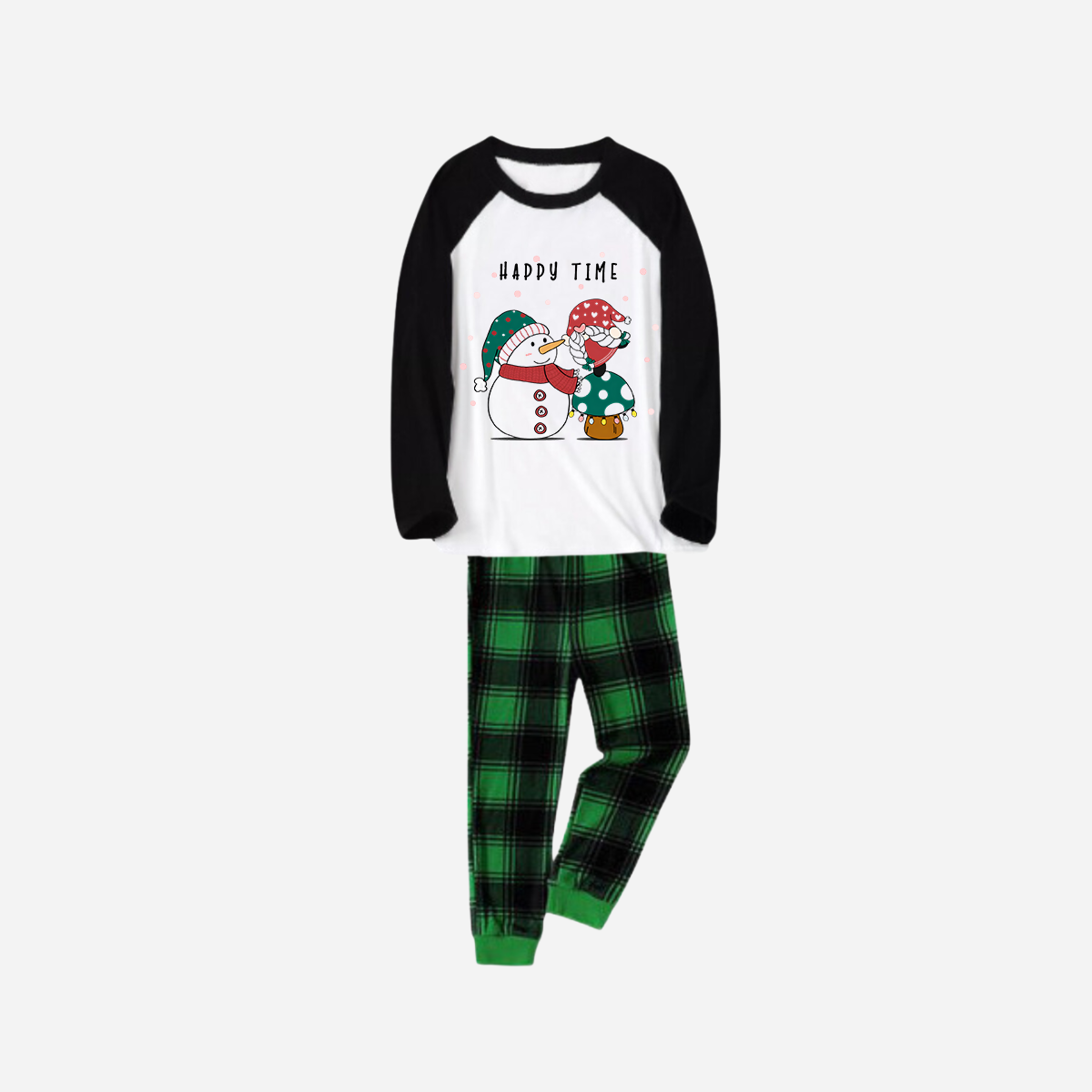 • Black Raglan Top Green Plaid Christmas Pajamas Set With Snowman and Gnome and "Happy Time" Text Print